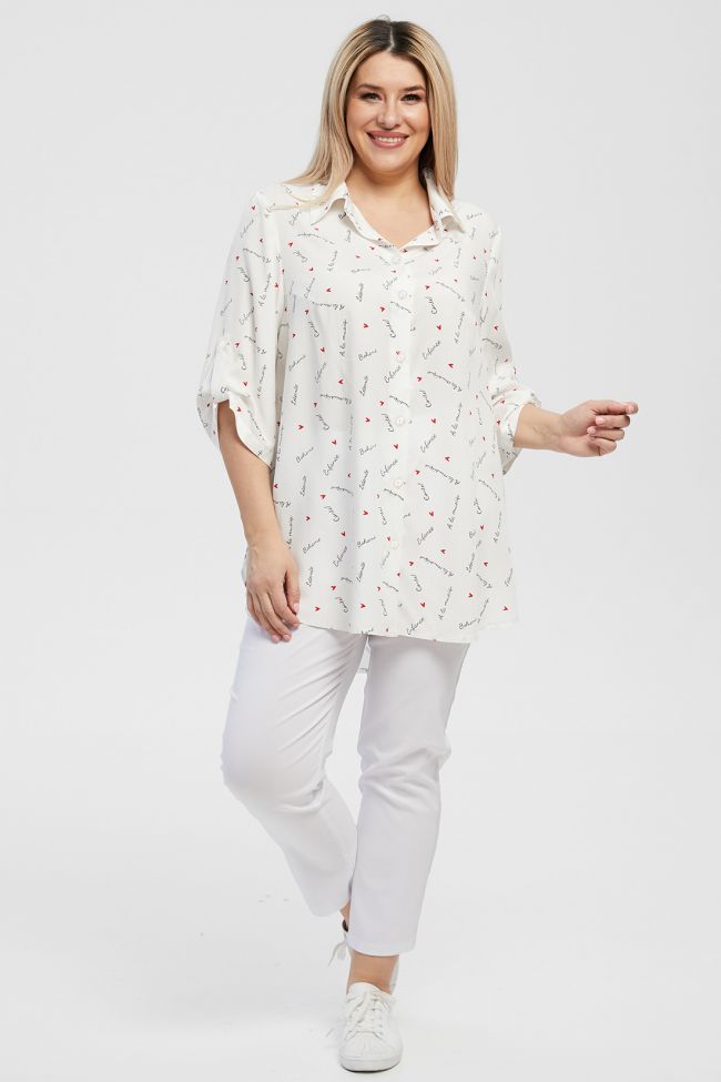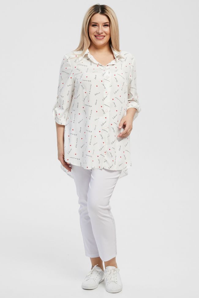 белый Стильная рубашка свободного силуэта из штапельной ткани. Горловина оформлена отложным воротником на притачной стойке. Центральная застежка на петли и пуговицы (пуговицы белого цвета). Прилегание по груди за счет вытачек. По спинке притачная кокетка. Низ ассиметричный с разрезами округлой формы. Рубашечный рукав длиной за локоть, дополнен патой. Модель отлично украсит гардероб любой модницы.
