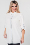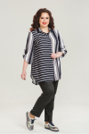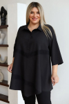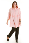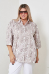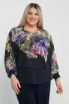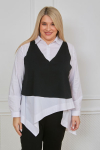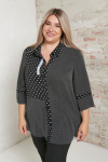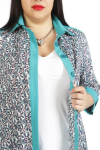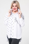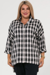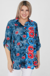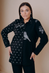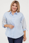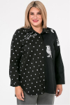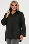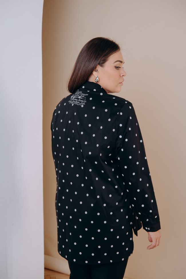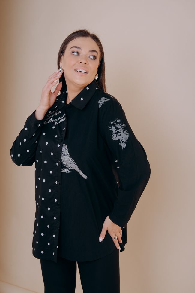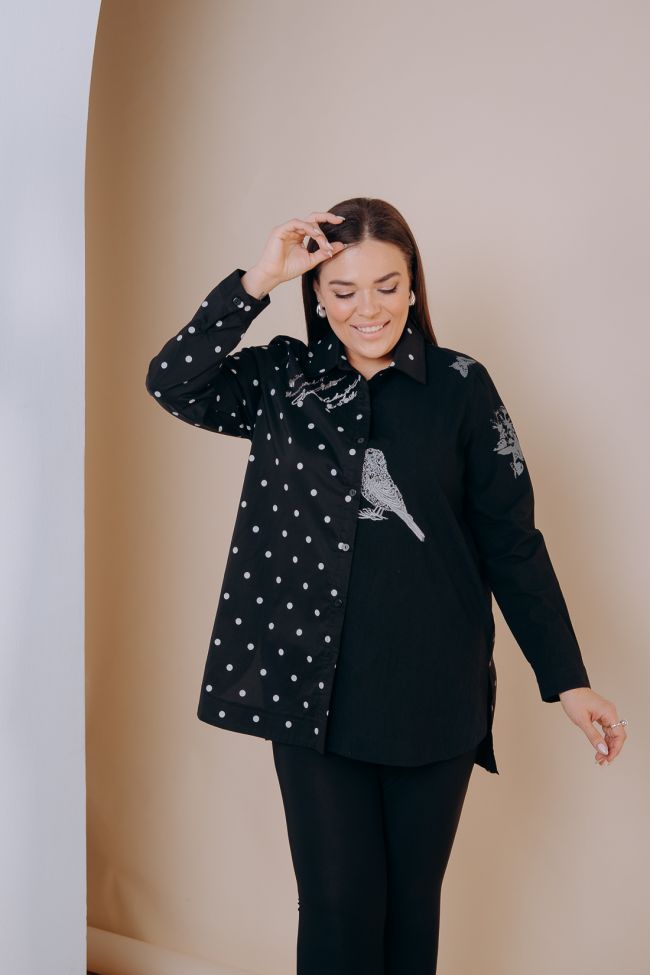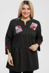 черный Стильная хлопковая рубашка прямого силуэта смело комбинирует разные по фактуре материалы, сочетает в себе принт и вышивку. Длина изделия классическая – до линии бедер. В боковых швах разрезы. Низ переда закруглен и обработан обтачкой, низ спинки прямой и длиннее переда. Такое дизайнерское решение позволяет носить рубашку навыпуск. Рукав длинный до запястья с отрезной манжетой и застежкой на петлю и пуговицу. Круглая горловина оформлена отложным воротником с отрезной стойкой. Центральная застежка выполнена на петли и пуговицы
