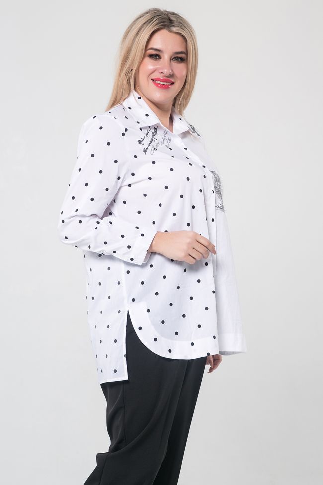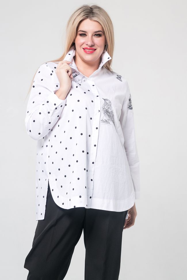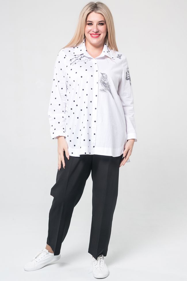 белый Стильная хлопковая рубашка прямого силуэта смело комбинирует разные по фактуре материалы, сочетает в себе принт и вышивку. Длина изделия классическая – до линии бедер. В боковых швах разрезы. Низ переда закруглен и обработан обтачкой, низ спинки прямой и длиннее переда. Такое дизайнерское решение позволяет носить рубашку навыпуск. Рукав длинный до запястья с отрезной манжетой и застежкой на петлю и пуговицу. Круглая горловина оформлена отложным воротником с отрезной стойкой. Центральная застежка выполнена на петли и пуговицы