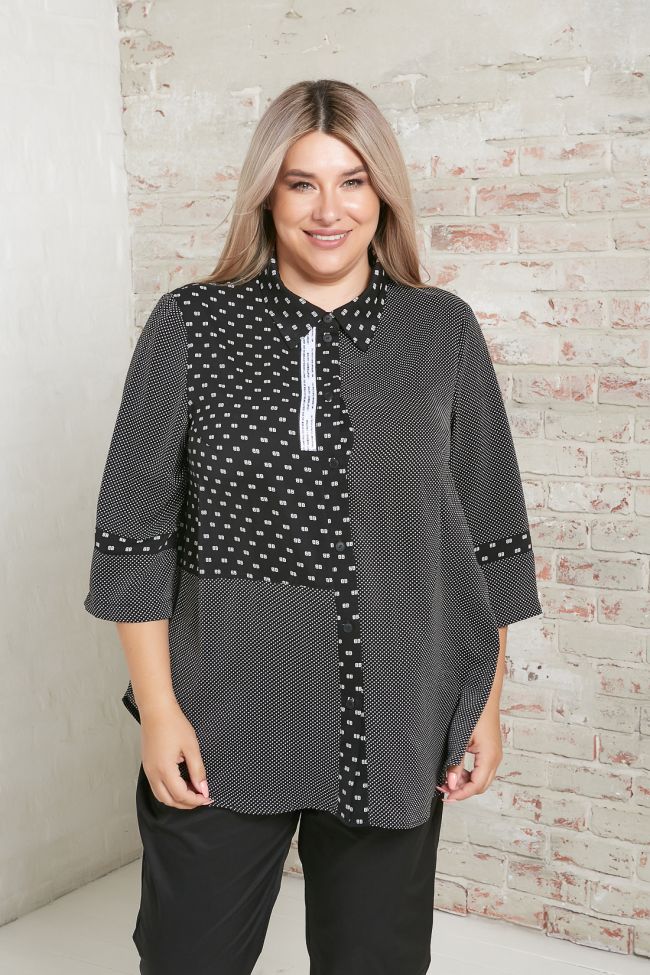черный Рубашка свободного силуэта, из комбинированной ткани "ниагара" в принт. В виде отделки: вставка по правой части переда, кокетка спинки, воротник, планка и вставка по рукавам - выполнены из ткани компаньона. В дополнение к отделке, по правой части переда декоративная контрастная тесьма. Прилегание по груди за счет вытачек. Воротник рубашечного типа, центральная застежка на петли - пуговицы. Втачные рукава длиной 7/8.  Низ с актуальным закруглением.