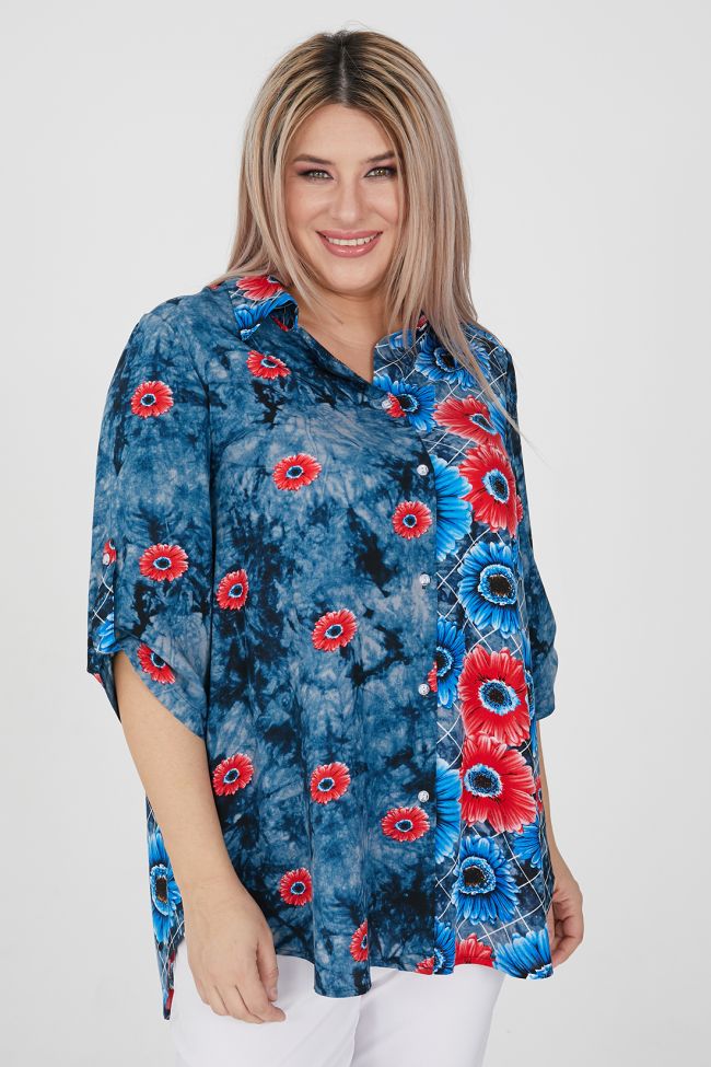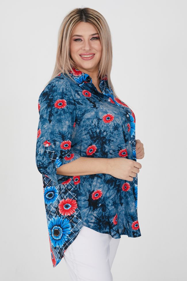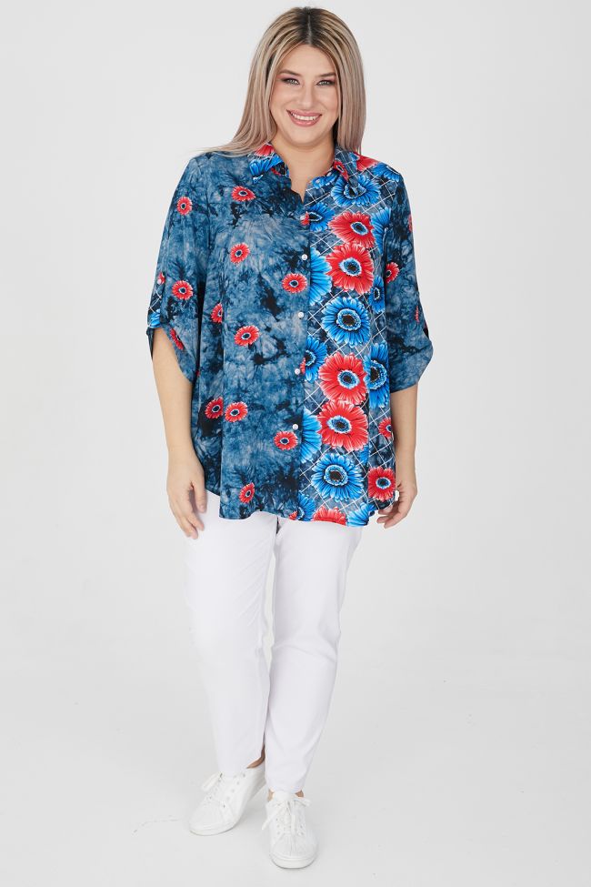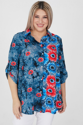 синий Оригинальная яркая рубашка свободного силуэта из хлопковой ткани. Центральная застежка на петли и пуговицы. Горловина оформлена отложным воротником на притачной стойке. Прилегание по груди за счет вытачек. По спинке притачная кокетка. Рубашечный рукав длиной за локоть, дополнен патой. Низ с актуальным закруглением. Правая часть переда, рукава и кокетка спинки выполнены из ткани с принтом "мелкие цветы". Левая часть переда, спинка, воротник и паты с крупными цветами. Интересное решение для создания эффектных образов.