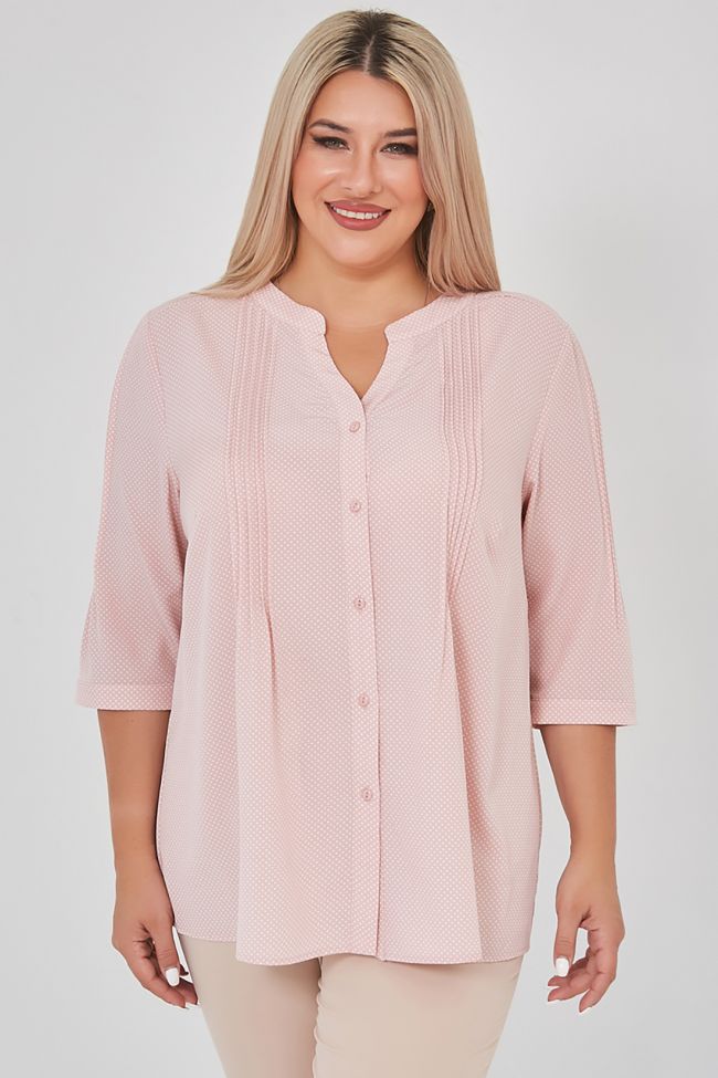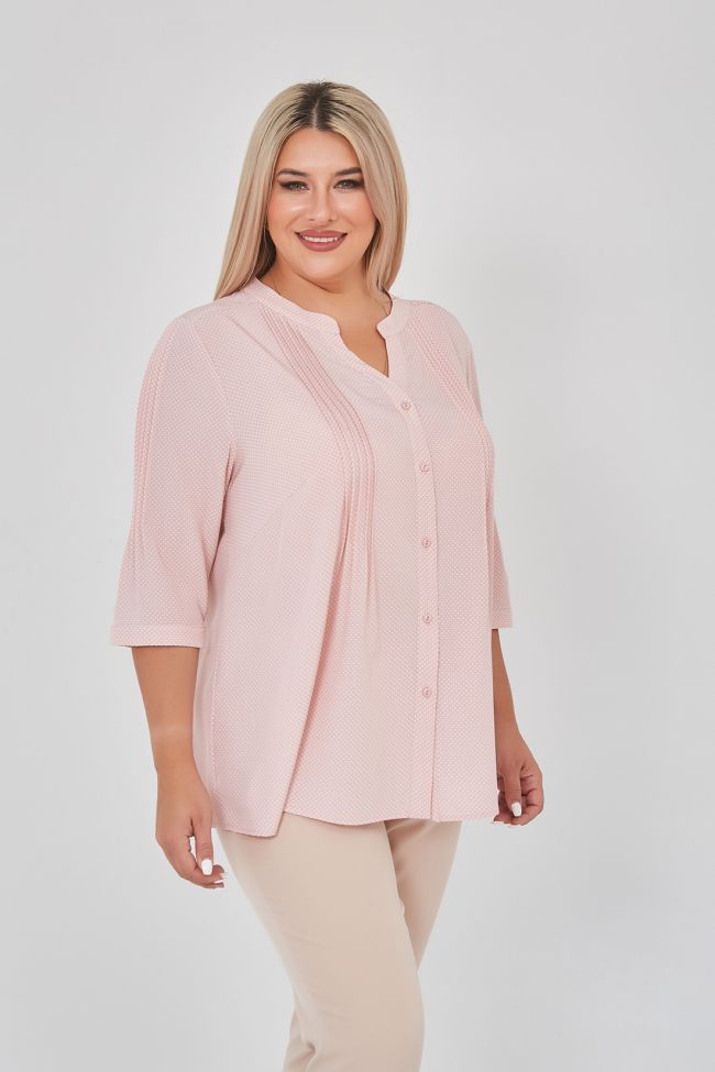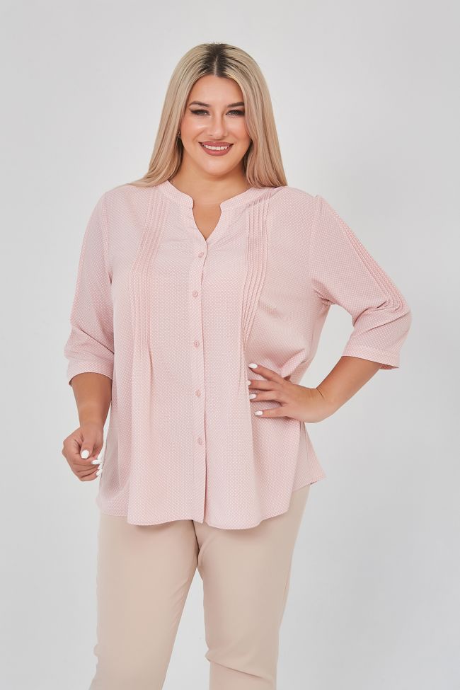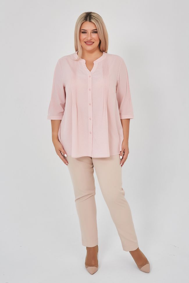 розовый Стильная рубашка свободного силуэта из сорочечной ткани в мелкий горох. По переду планка - поло с застежкой на петли и пуговицы. Прилегание по груди за счет вытачек. Спинка с отрезной кокеткой, переходящей на перед. Фигурный вырез горловины оформлен обтачкой. Рукава длиной 3/4. В виде декоративной отделки по переду, центру спинки и центру рукава - оригинальные мелкие складки. Низ ровный.