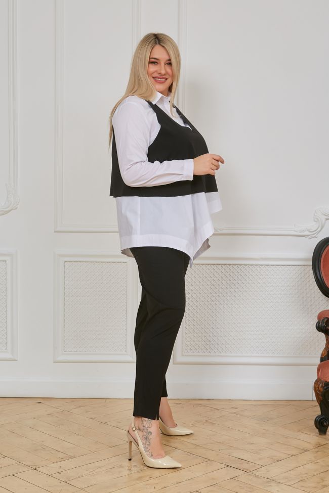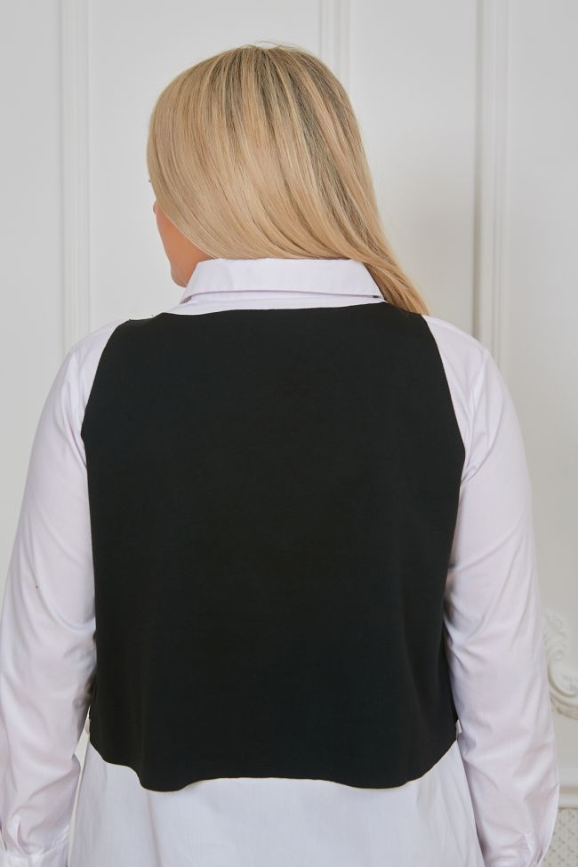 черно-белый Стильная рубашка расклешенного силуэта выполнена из хлопковой ткани  Модель с центральной застежкой - планкой на петли и пуговицы, до уровня груди. Горловина оформлена отложным воротником. Рукав втачной длинный по низу дополнен манжетой с застёжкой на петлю и пуговицу. Низ асимметричный, левый боковой шов оформлен шлицей. В комплекте с рубашкой – укороченный жилет расклешенного силуэта, V – образный вырез горловины. Изделие с открытыми срезами горловины, проймы и низа.