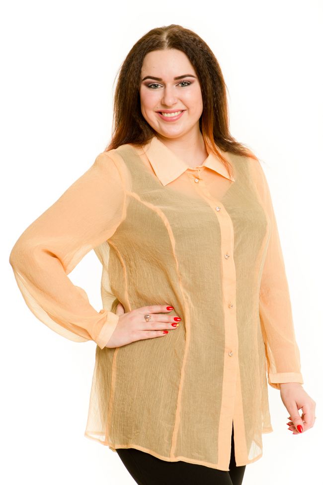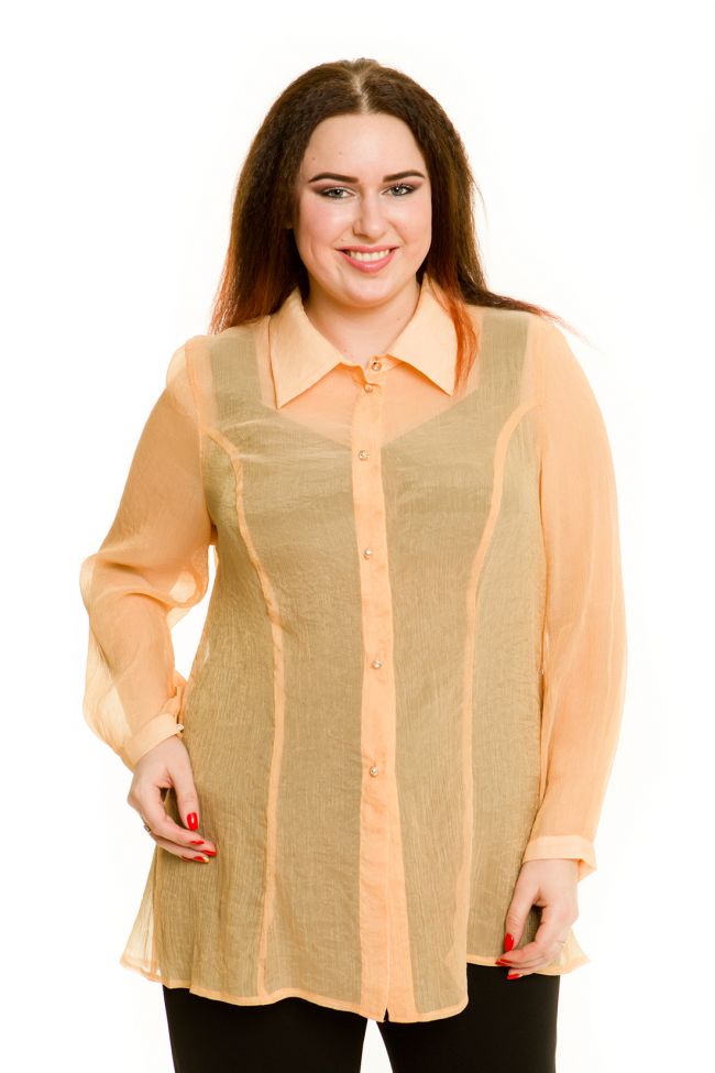 бежевый Оригинальная рубашка расширенного силуэта из шифона-креш. Горловина оформлена отложным сорочечным воротником на стойке. По центру переда застежка на петли пуговицы. Низ асимметричный, удлинен по спинке. Длинные втачные рукава с манжетой по низу застегиваются на одну петлю-пуговицу. По спинке встречная складка, дающая полную свободу движениям. Замечательно как самостоятельное изделие, так и дополненное топом.  Рубашка идеально подойдет под сарафаны, жакеты, жилеты и подчеркнет индивидуальность вашего образа.