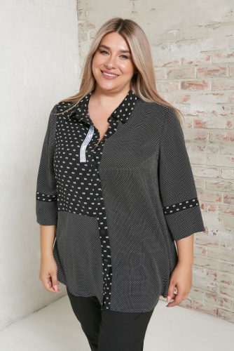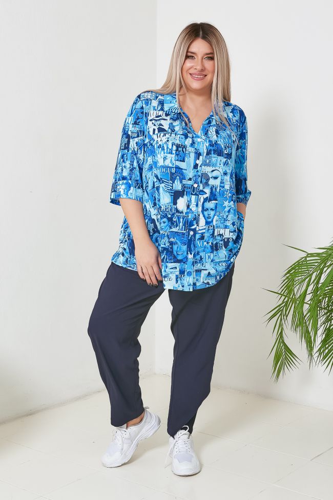 синий Яркая рубашка свободного силуэта, из эластичного трикотажного полотна с актуальным принтом "газета". V-образный вырез горловины подчеркнут притачными планками и оформлен отложным воротником. Втачные рукава длиной чуть за локоть. Центральная застежка на петли-пуговицы. Вы можете комбинировать рубашку с юбками или брюками, создавая интересные образы.