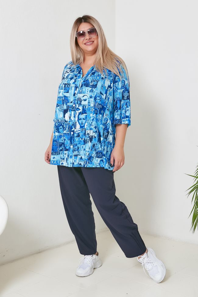 синий Яркая рубашка свободного силуэта, из эластичного трикотажного полотна с актуальным принтом "газета". V-образный вырез горловины подчеркнут притачными планками и оформлен отложным воротником. Втачные рукава длиной чуть за локоть. Центральная застежка на петли-пуговицы. Вы можете комбинировать рубашку с юбками или брюками, создавая интересные образы.