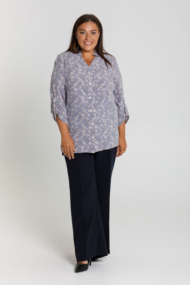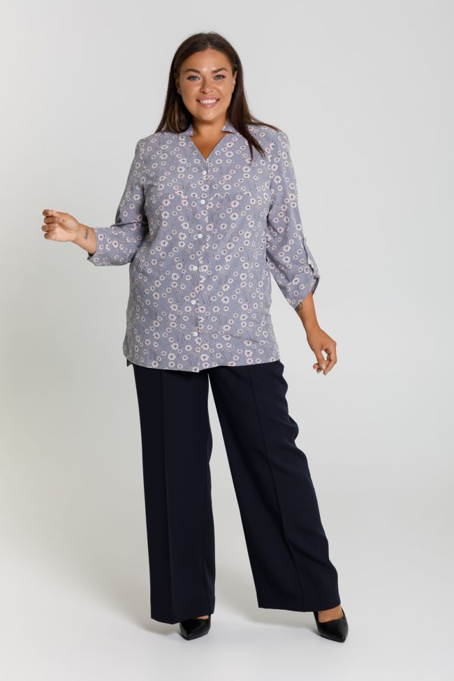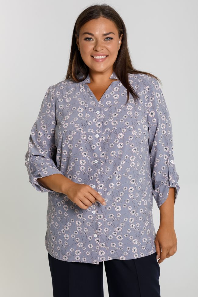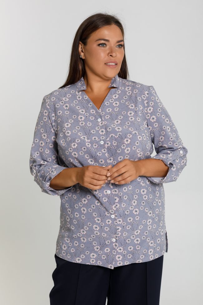светло-серый Рубашка свободного силуэта из блузочной ткани. Фигурный вырез горловины с воротником-стойкой. Втачные рукава  длиной 7/8, дополнены патой. По переду горизонтальный подрез  в области груди. Модель с  центральной застежкой  на петли и пуговицы. По бокам разрезы, низ разноуровневый.