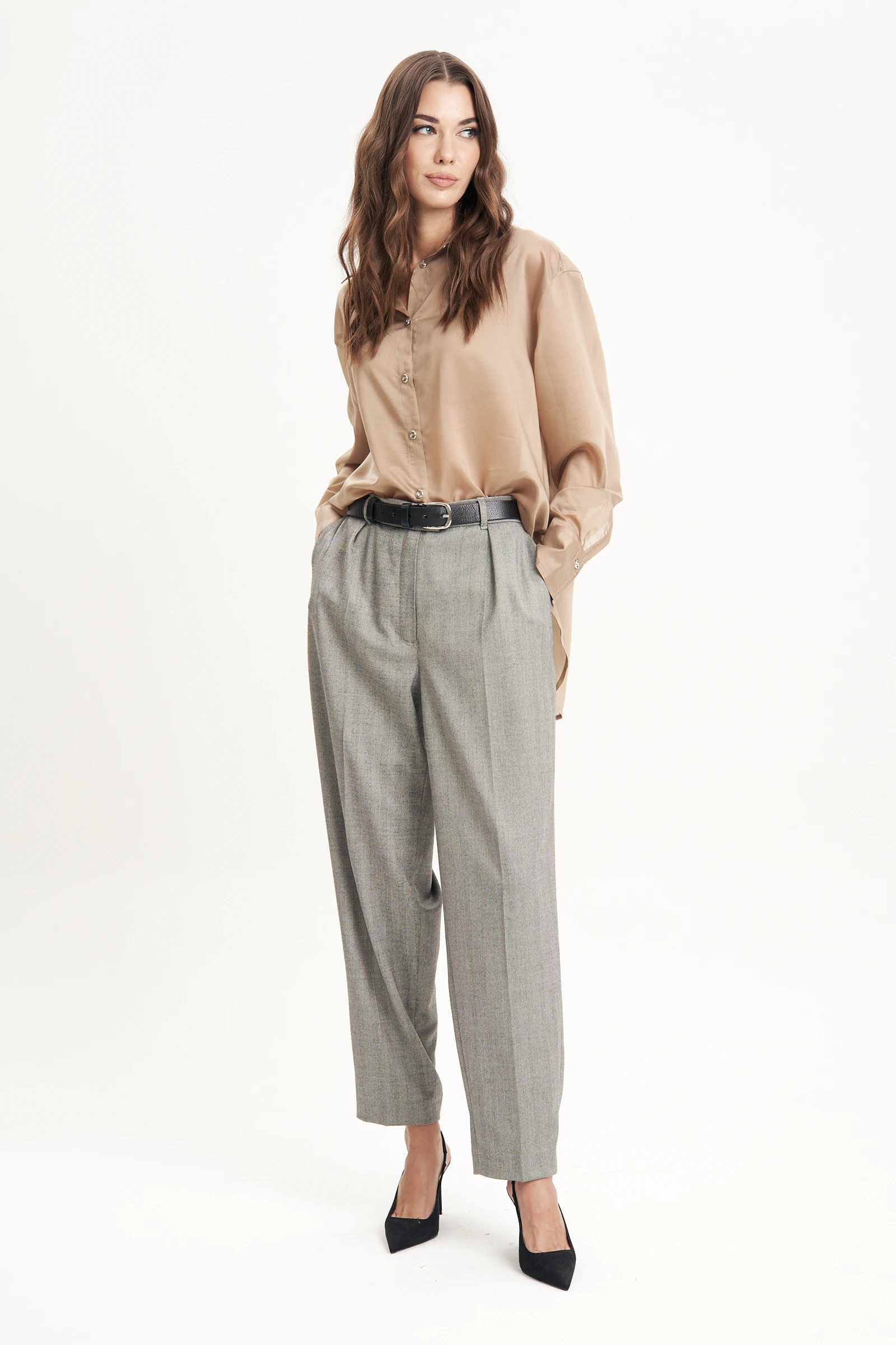 Свободная классического, рубашечного покроя, с цельной застёжкой и воротником-стойкой.Спинка с отрезной кокеткой и мягкой бантовой складкой. Рукав рубашечный с отрезной манжетой на застёжке.