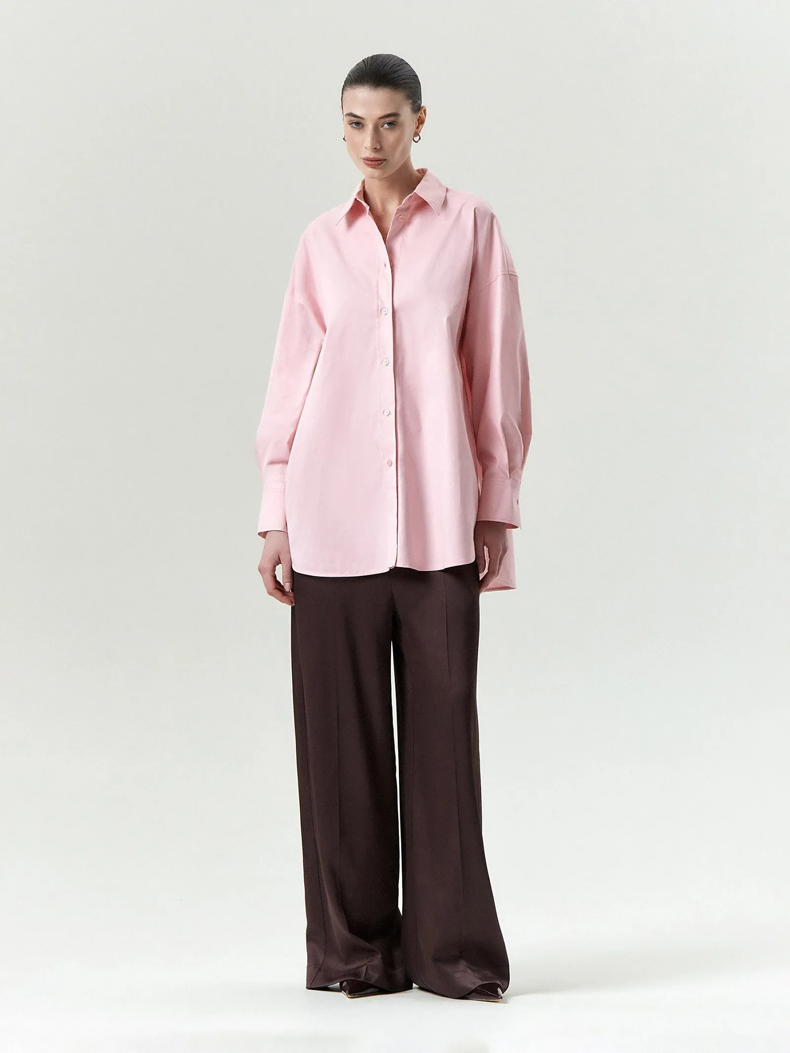 Оверсайз-рубашка со спущенным плечом и складкой на спинке выполнена в стилистике классических мужских рубашек и имеет традиционную для них фактуру, но при этом отличается женственным цветовым решением. Приятный глазу розовый оттенок идеально комбинируется с не теряющими актуальности шоколадным, бежевым, модным оливковым и хаки. Материал полностью состоит из хлопка. Удлинённая модель подходит для стилизаций с разнообразными поясами. Рубашку можно носить с любым базовым денимом, костюмными брюками и юбками.