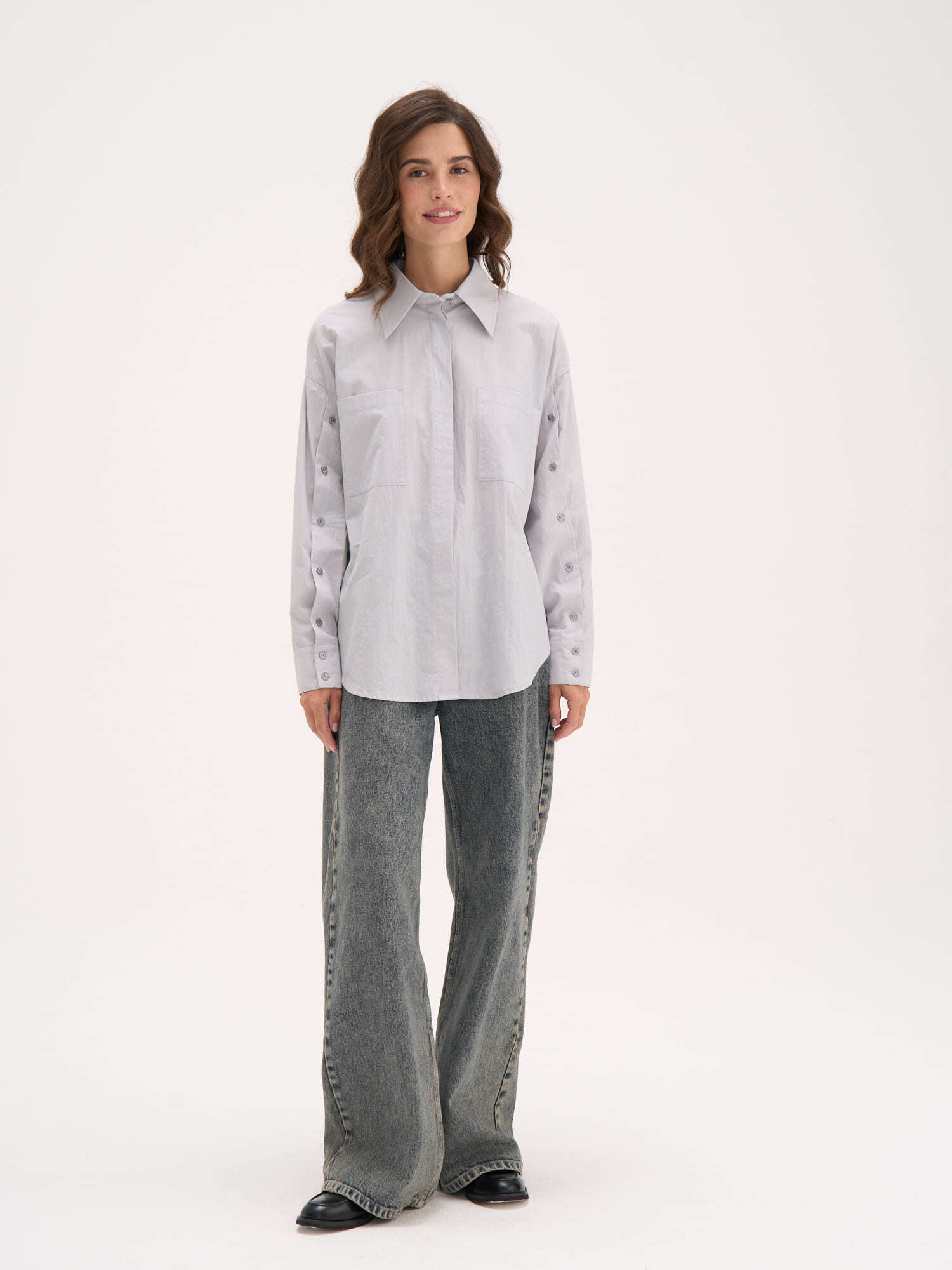 Чистые линии и продуманные детали: широкие рукава с застежкой на пуговицы позволяют носить модель как классическую рубашку или легким движением превратить в элегантный кейп.