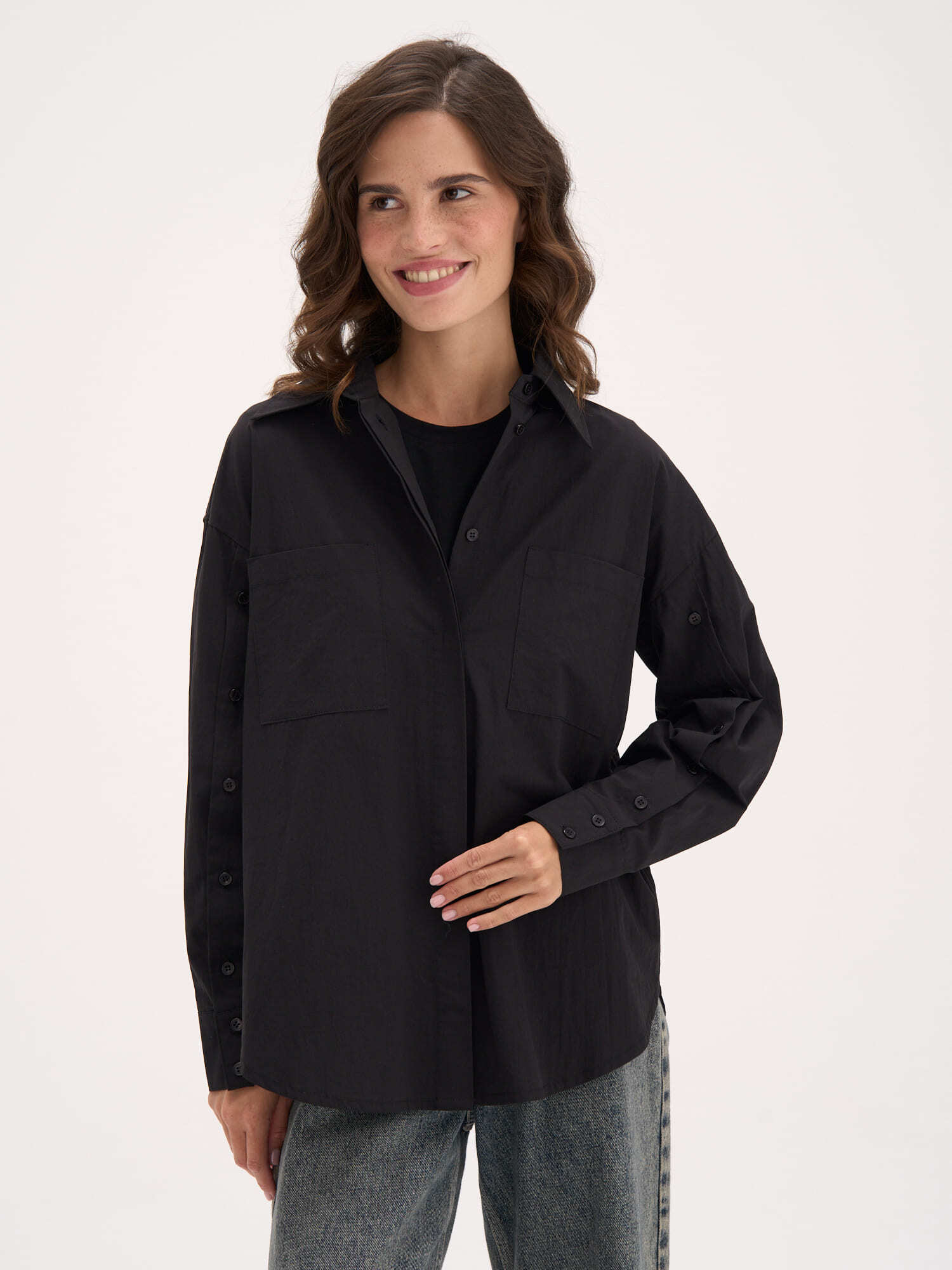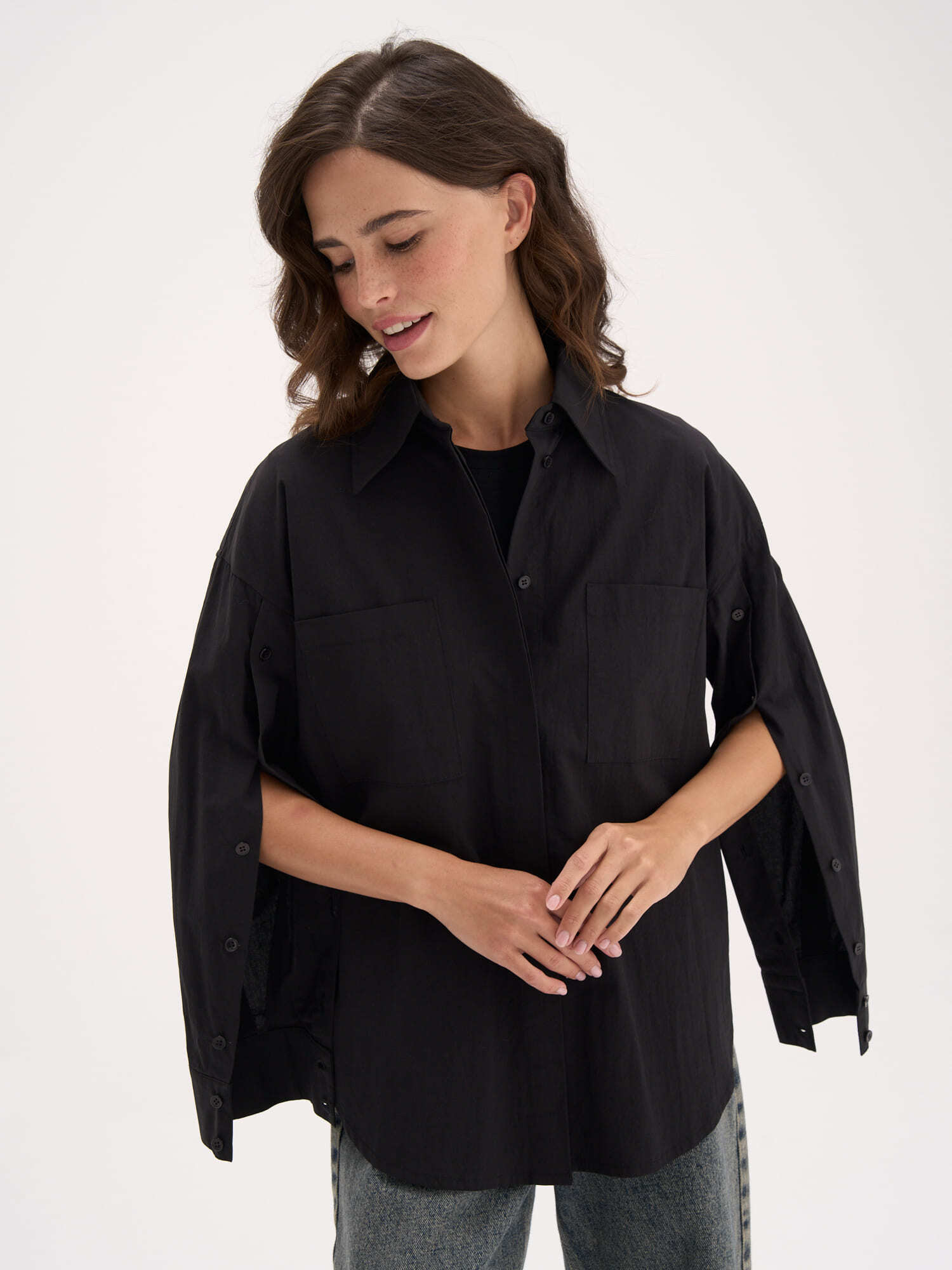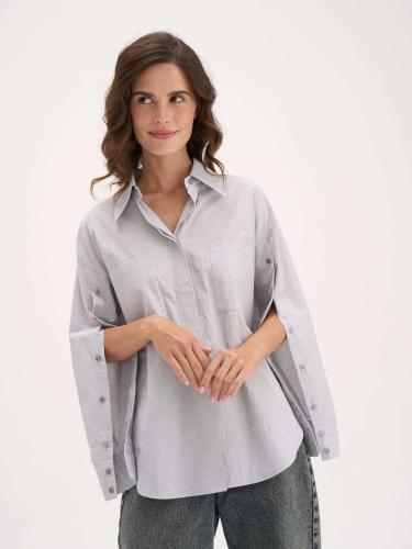 Чистые линии и продуманные детали: широкие рукава с застежкой на пуговицы позволяют носить модель как классическую рубашку или легким движением превратить в элегантный кейп.