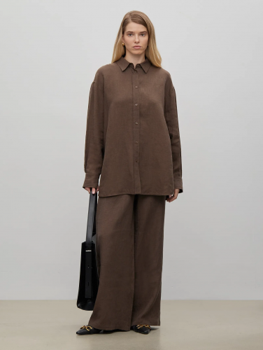 Рубашка изо льна в кофейном цвете. Удлинённая модель отличается ещё одной планкой с рядом пуговиц на спинке. Это позволяет регулировать степень открытости, создавая более смелые стилизации. Завершить образ с рубашкой можно брюками из комплекта.