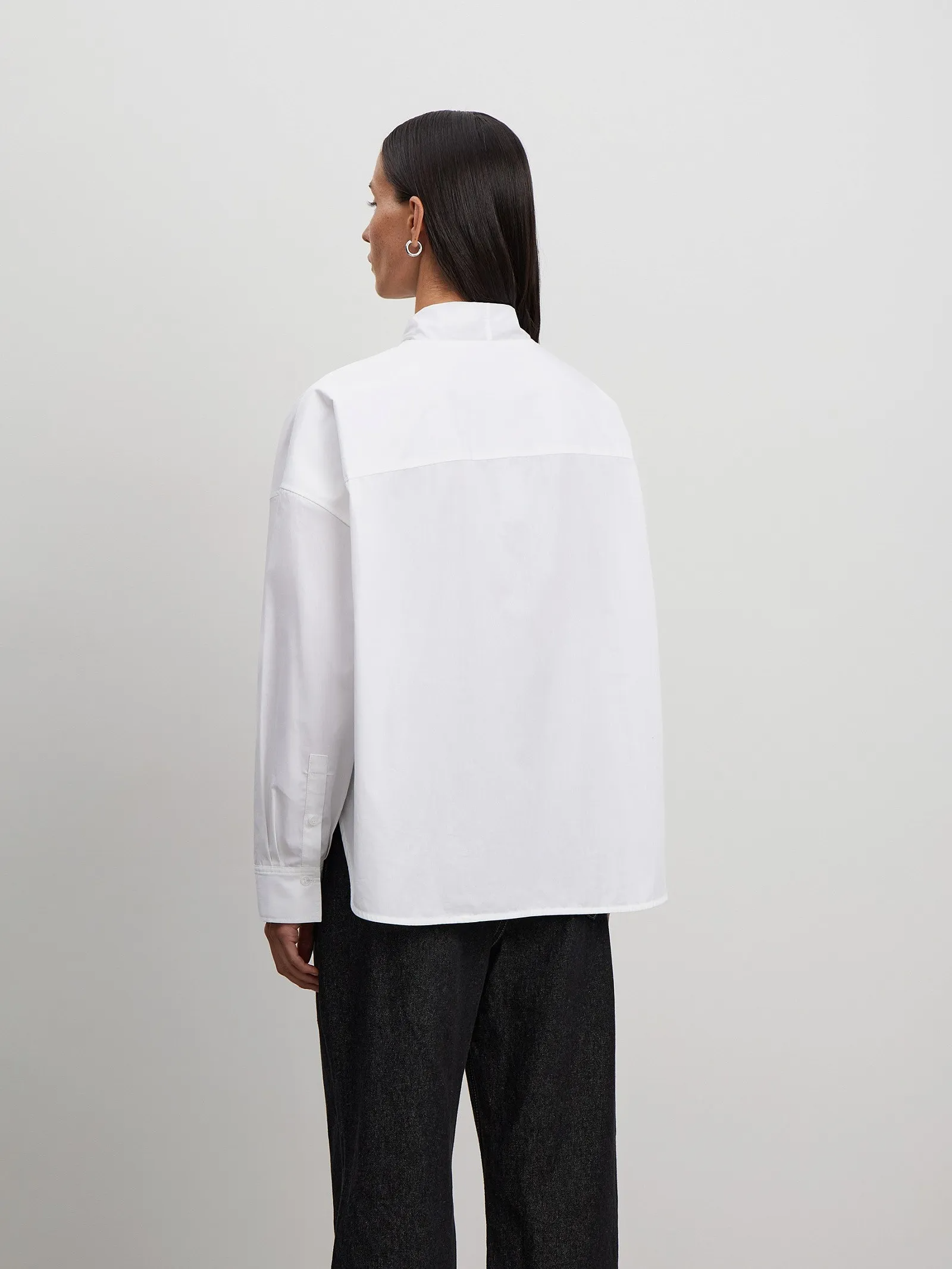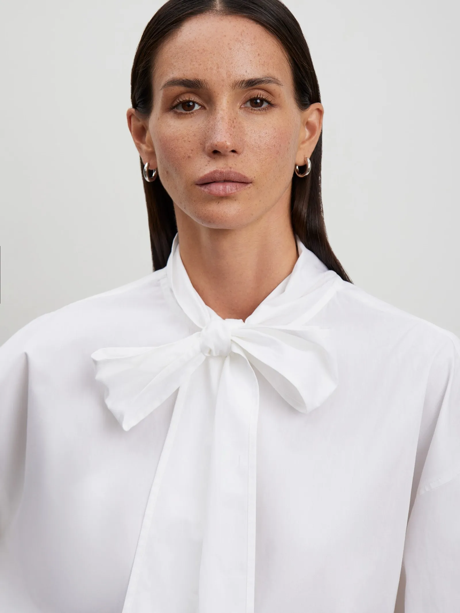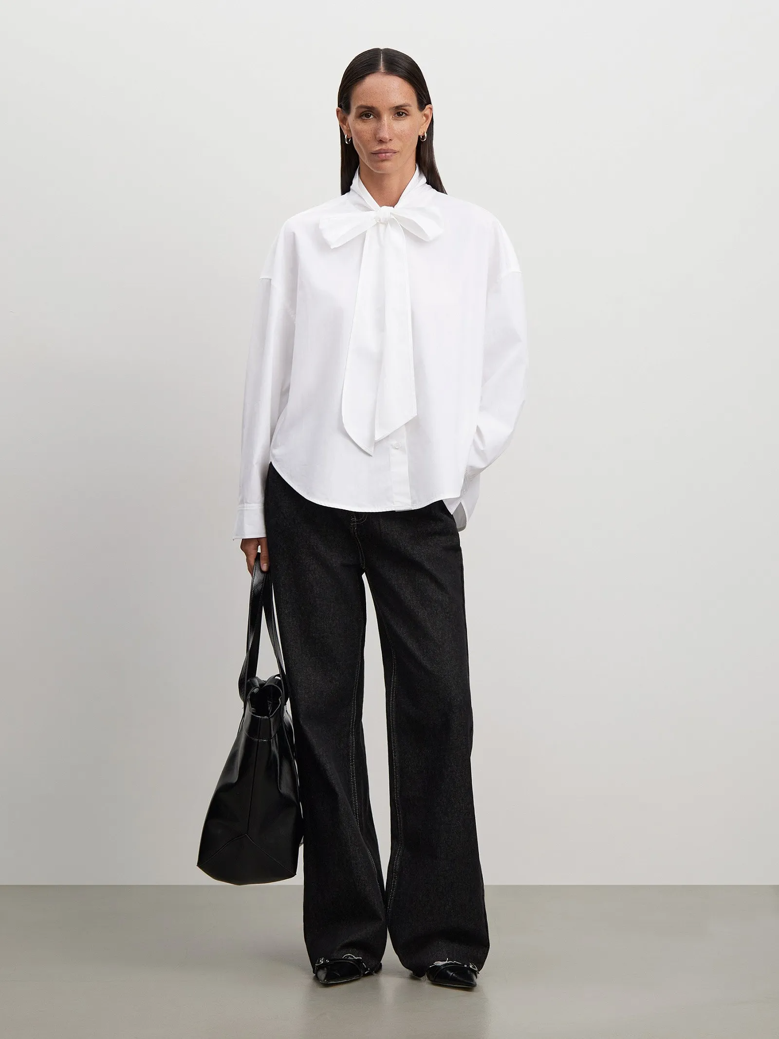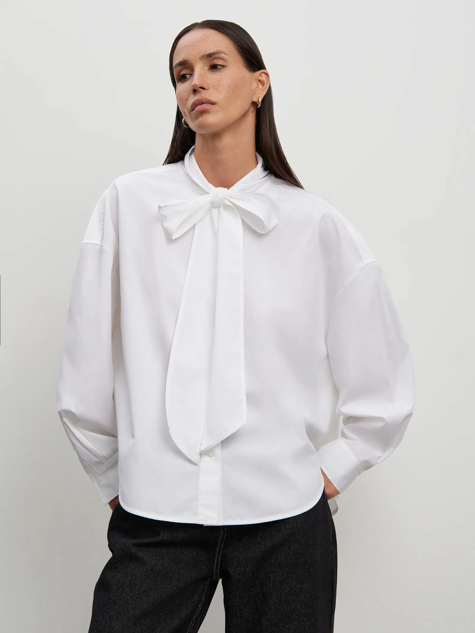 Модная рубашка с бантом придаст образу большей эстетичности. Выполнена из хлопка в белом цвете. Модель прямого кроя имеет спущенное плечо. Сочетается с любым базовым низом, подходит для работы и торжественных случаев.
