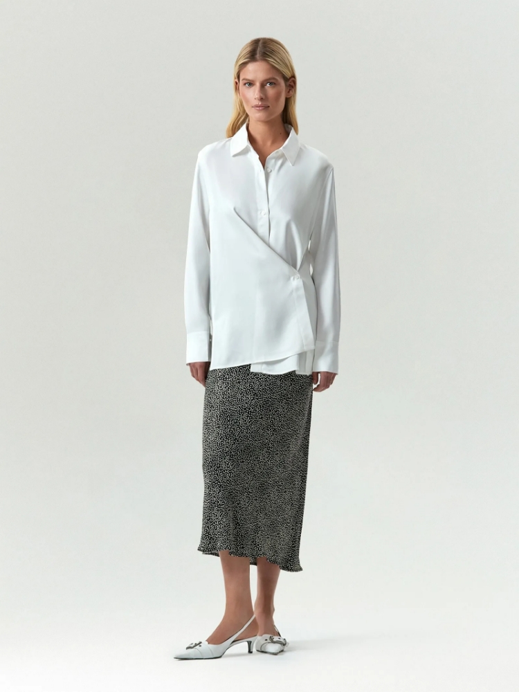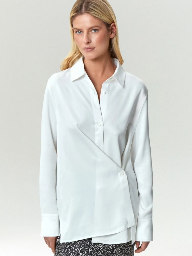 Однотонная белая рубашка из комфортной вискозы для офисных и повседневных образов. Классическая модель с кокеткой на спинке подойдёт к любому базовому низу