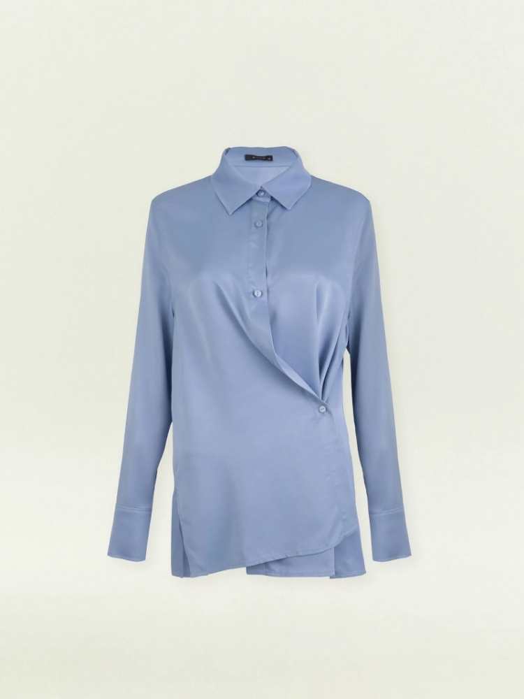 Однотонная сатиновая рубашка из комфортной вискозы для офисных и повседневных образов. Классическая модель с кокеткой на спинке подойдёт к любому базовому низу. Выполнена в трендовом голубом цвете