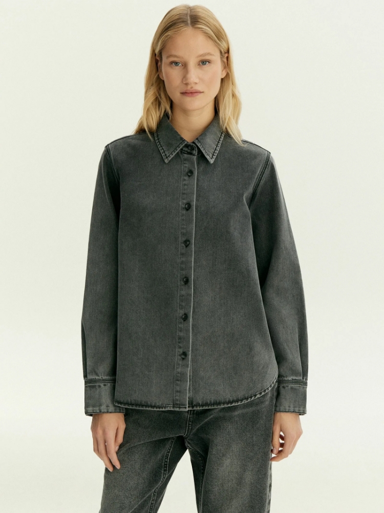 Рубашка для кэжуальных образов из мягкого денима в приятном оттенке графита, с лёгким винтажным эффектом. Модель выполнена с кокеткой сзади. Оттенок джинсовки позволяет сочетать её с разными близкими по тону джинсами коллекции, получая гармоничный образ