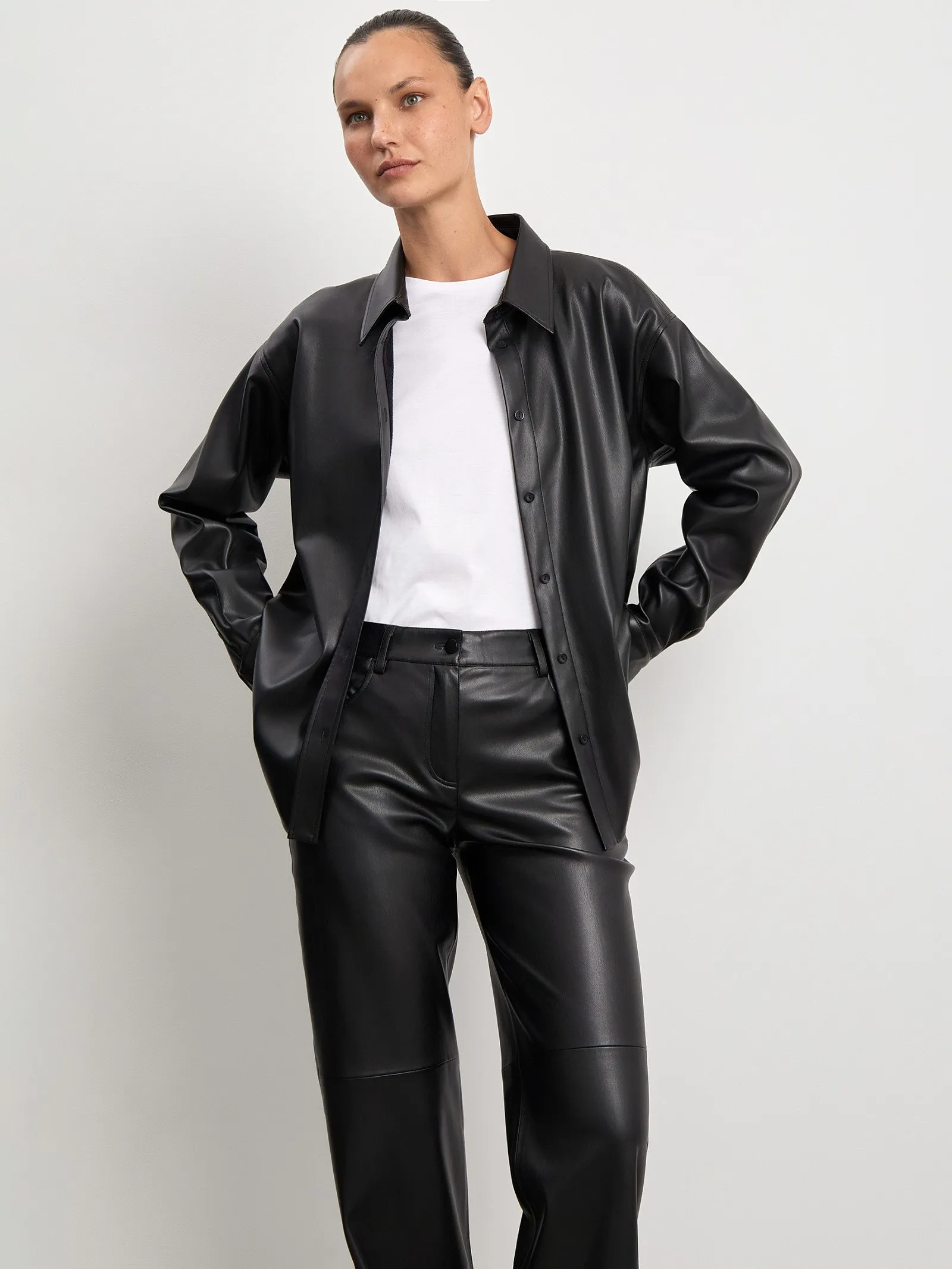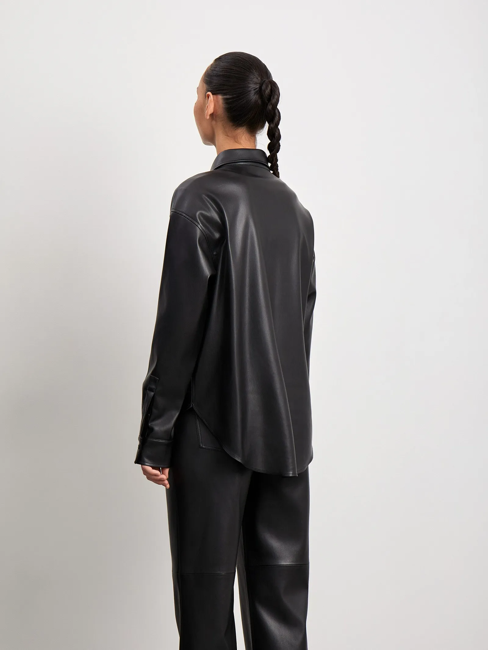 Рубашка из экокожи в чёрном цвете — модная вещь сезона. Хорошо подходит в качестве второго слоя. Удлинённая модель имеет прямой крой. Выполнена без кокетки на спинке. Завершить образ можно брюками из комплекта. Изделие изготовлено без подкладки.