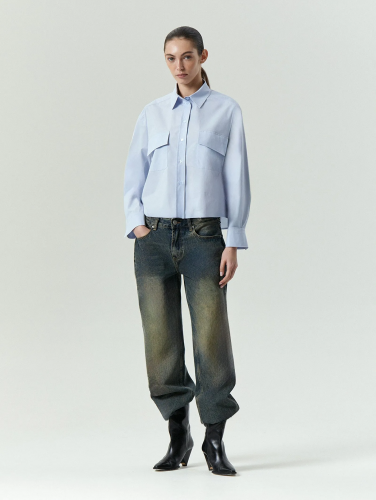 Рубашка в светлом голубом оттенке освежит офисные и кэжуальные образы. Выполнена из хлопка с небольшим добавлением эластана для комфортной посадки. Трендовая укороченная модель имеет подспущенный рукав с объемной проймой и складкой, а также накладные карманы. Хорошо подойдёт к брюкам или юбке с завышенной посадкой.