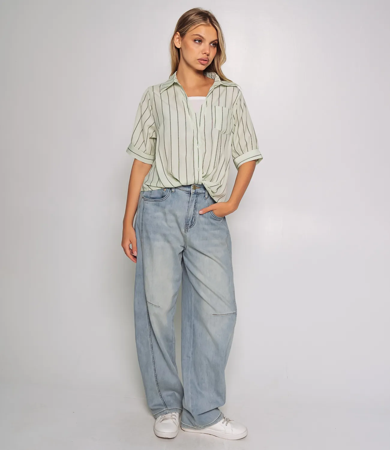 Рубашка — это ключевой элемент гардероба, который способен подчеркнуть уникальность и стиль каждой женщины. Эта модель станет настоящим хитом среди ваших покупателей, благодаря своему современному дизайну и высокому качеству. Изготовленная на 100% из легкой ткани с вертикальным узором в виде тонких полосок, рубашка дарит комфорт и позволяет коже дышать в любое время года. Свободный крой и короткие рукава, заканчивающиеся широкими манжетами, делают рубашку идеальной для создания непринужденного и стильного образа. Классический воротник и застежка на пуговицы придают изделию аккуратность и элегантность. Накладной карман на груди добавляет детали и функциональности, завершая этот привлекательный образ. Необычный нюанс — рубашка застегнута не полностью, что создает расслабленный и модный вид. Нижняя часть модели аккуратно присборена или может быть заправлена, добавляя динамики и интересного эффекта в вашем наряде. Эта рубашка станет отличным выбором для повседневной носки, идеально сочетаясь как с джинсами, так и с брюками или юбками. Она привлечет внимание тех, кто ценит сочетание стиля и комфорта. Мы предоставили на сайте таблицу размеров, чтобы ваши клиенты могли легко выбрать идеальный размер и не сомневаться в своем выборе. Предложенная нами цена является доступной для оптовых закупок, что делает эту рубашку замечательным дополнением вашего ассортимента. Не упустите возможность предложить своим покупателям стильную рубашку, которая подчеркнет их индивидуальность и поможет создать множество образов! Рост модели 168 см., 89-63-90.