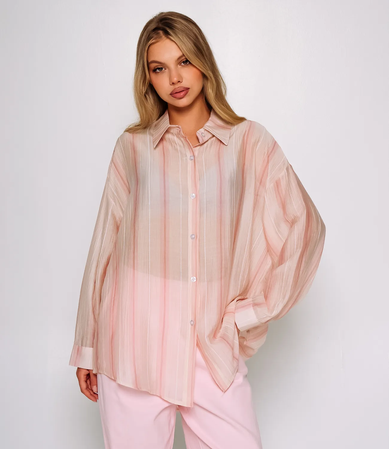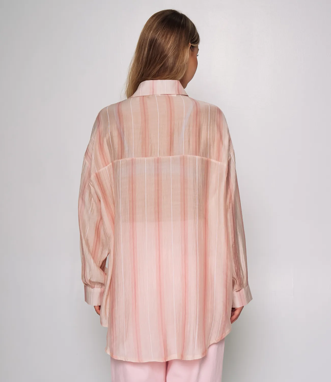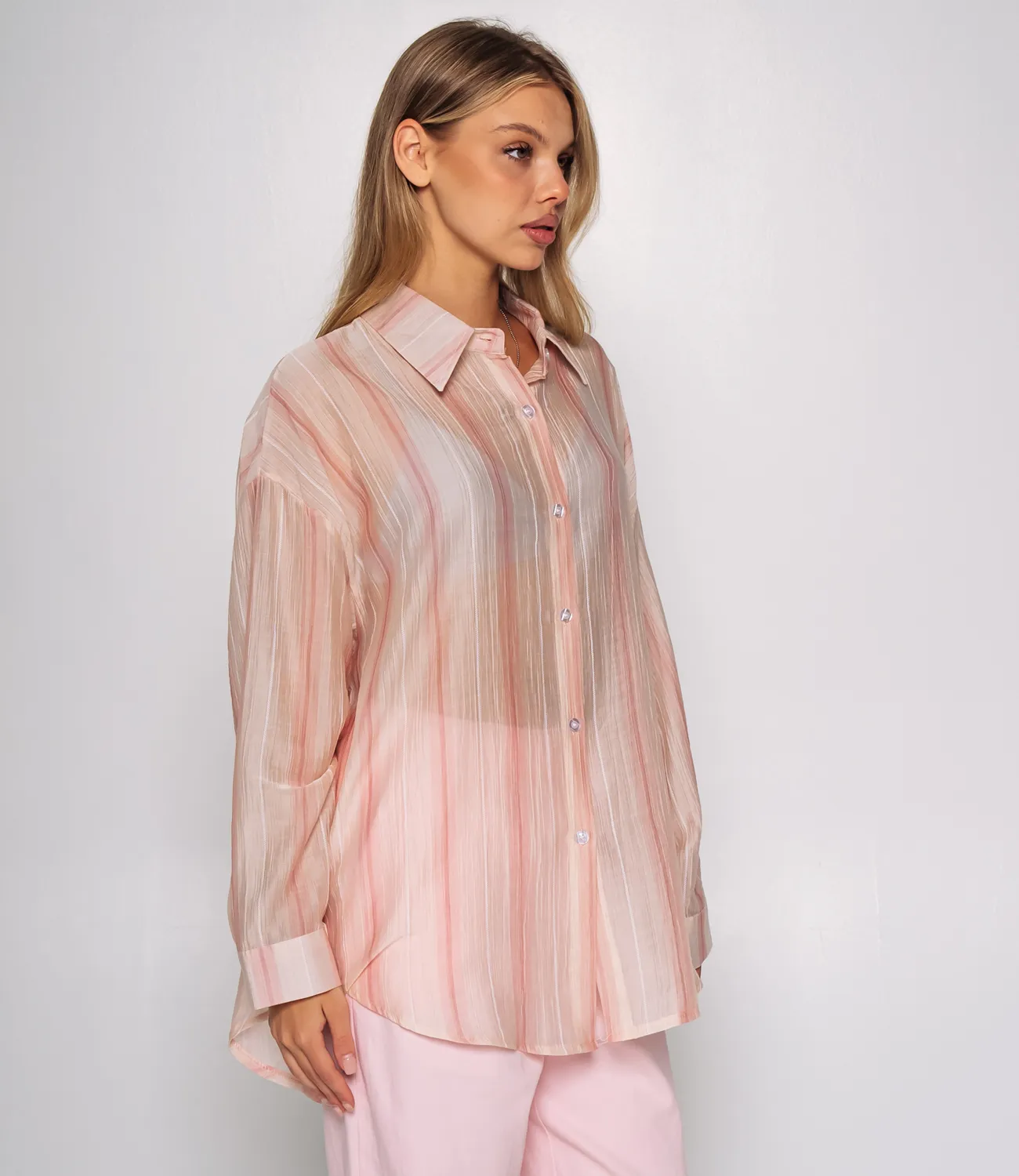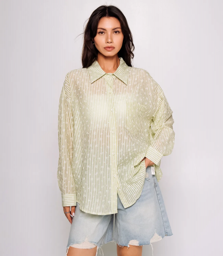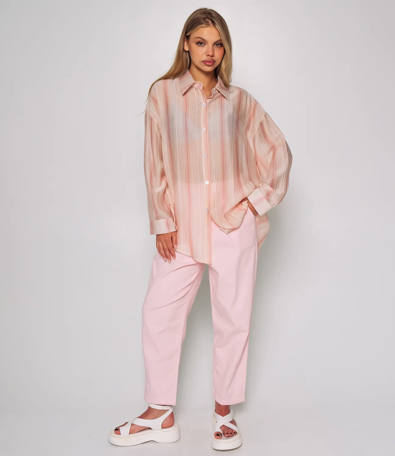 Рубашка — это незаменимый элемент гардероба, который выделяет индивидуальность и стиль каждой женщины. Эта модель станет настоящим украшением вашего ассортимента, привлекая внимание покупателей своим изысканным дизайном и высоким качеством материалов. Изготавливаемая из легкой, немного прозрачной ткани с тонкой вертикальной текстурой и полосатым узором, рубашка дарит комфорт и обеспечивает отличный микроклимат даже в жаркие дни. С классическим отложным воротником и застежкой на серию мелких пуговиц вдоль всей длины, рубашка выглядит стильно и аккуратно. Свободный покрой рукавов с широкими манжетами на пуговицах добавляет элемент легкости и расслабленности, превращая эту модель в идеальный выбор для повседневных образов. Слегка удлинённый фасон создаёт современный вид, позволяя сочетать рубашку как с джинсами, так и с юбками или брюками. Она будет отличным выбором для женщин, ценящих комфорт и стиль одновременно. Для удобства ваших покупателей мы уже предусмотрели на сайте таблицу размеров, чтобы они могли легко выбрать наиболее подходящий вариант и быть уверенными в своем выборе. Предложенная нами цена является доступной для оптовых закупок, что делает эту рубашку замечательной добавкой к вашему ассортименту. Не упустите возможность вдохновить ваших клиентов на создание стильных образов с помощью этой привлекательной модели!Рост модели 168 см., 89-63-90.