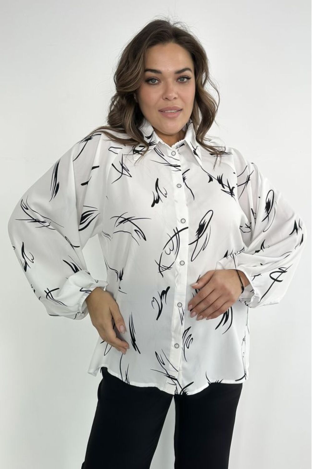 Женская рубашка прямого силуэта из шелковой ткани. Перед с центральной застежкой на петли и пуговицы. Горловина оформлена воротником рубашечного типа. Рукава покроя реглан, низ рукава типа фонарик, собран складками на резину. По низу боковых швов разрезы. Низ блузы прямой. Модель блузы дополнит повседневный и деловой гардероб.