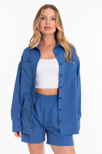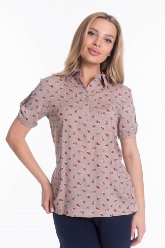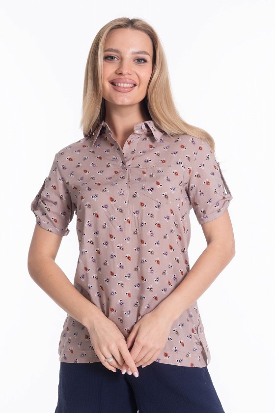 Рубашка женская с воротником-стойкой с застежкой на пуговицы, короткий рукав, нагрудный карман, рукава и низ по бокам оформлены планкой с пуговицами.