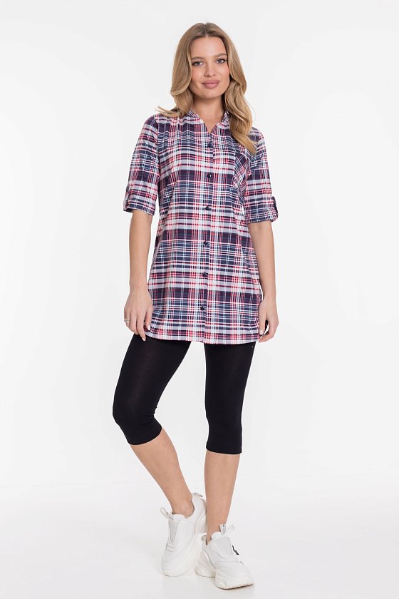 Рубашка с рукавом длиной 3/4 и центральной застёжкой на пуговицы. Воротник-стойка, спереди накладной карман, на рукавах и снизу по бокам отделка паты.