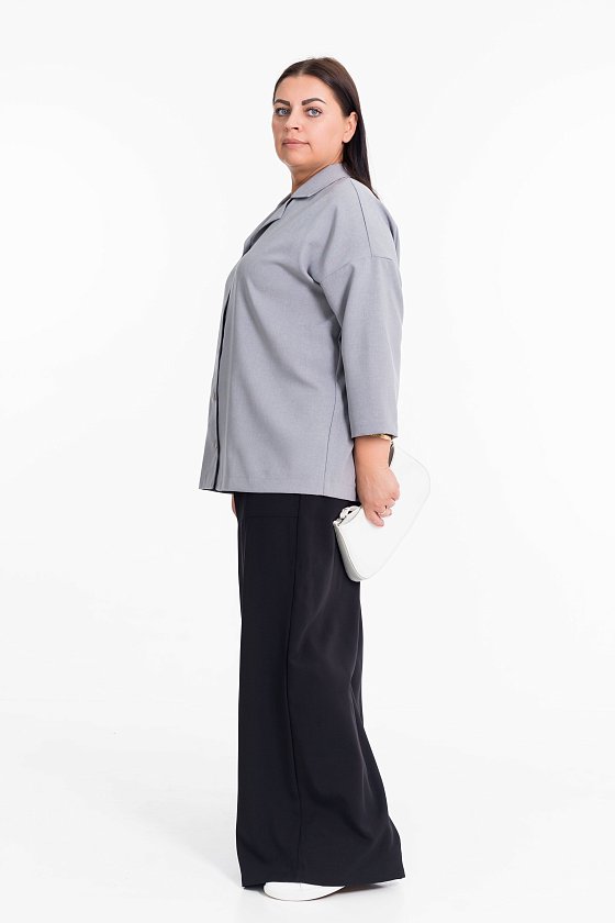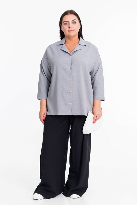 Женская рубашка серого цвета со спущенной линией плеча  — отличный выбор для создания элегантного образа. Модель застёгивается на пуговицы спереди, имеет отложной воротник. Однотонный дизайн добавляет рубашке универсальности и позволяет сочетать её с различными элементами гардероба.