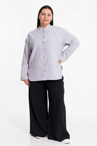 Женская рубашка свободного силуэта из однотонного искусственного льна синего цвета. С центральной застежкой на пуговицы, воротником стойкой и длинным рукавом рубашечного покроя. Рукав прямой без манжеты для легкого отворота. Спереди декоративные длинные накладные карманы.