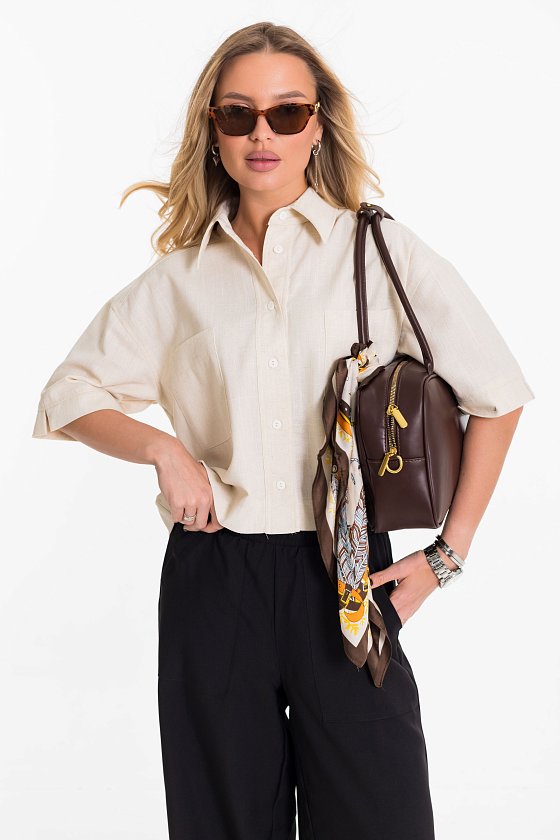 Рубашка выполнена из однотонного натурального льна с вискозой. Рубашка короткая, свободного силуэта с застёжкой на пуговицы спереди. Воротник на отрезной стойке, спереди размещены накладные карманы, рукава короткие с притачной планкой.
