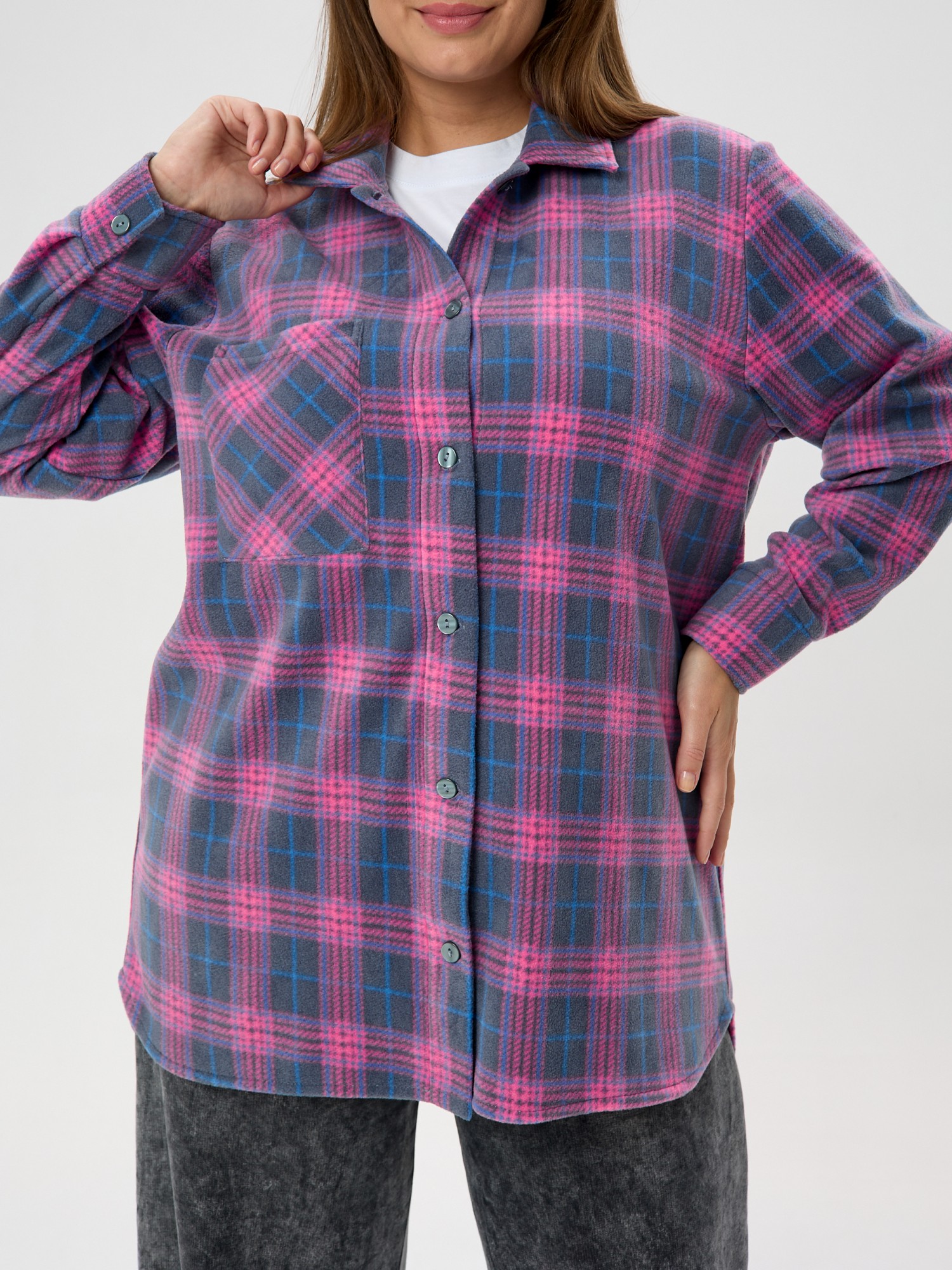 Рубашка (туника) женская из трикотажного полотна «флис» с набивным рисунком «клетка», свободного силуэта, с длинными втачными рукавами напритачных манжетах, стояче-отложным воротником, нагрудным карманом,фигурным низом и центральной бортовой застежкой на петли и пуговицы. Спинка – с отрезной кокеткой и бантовой складкой в центре соединительного шва.