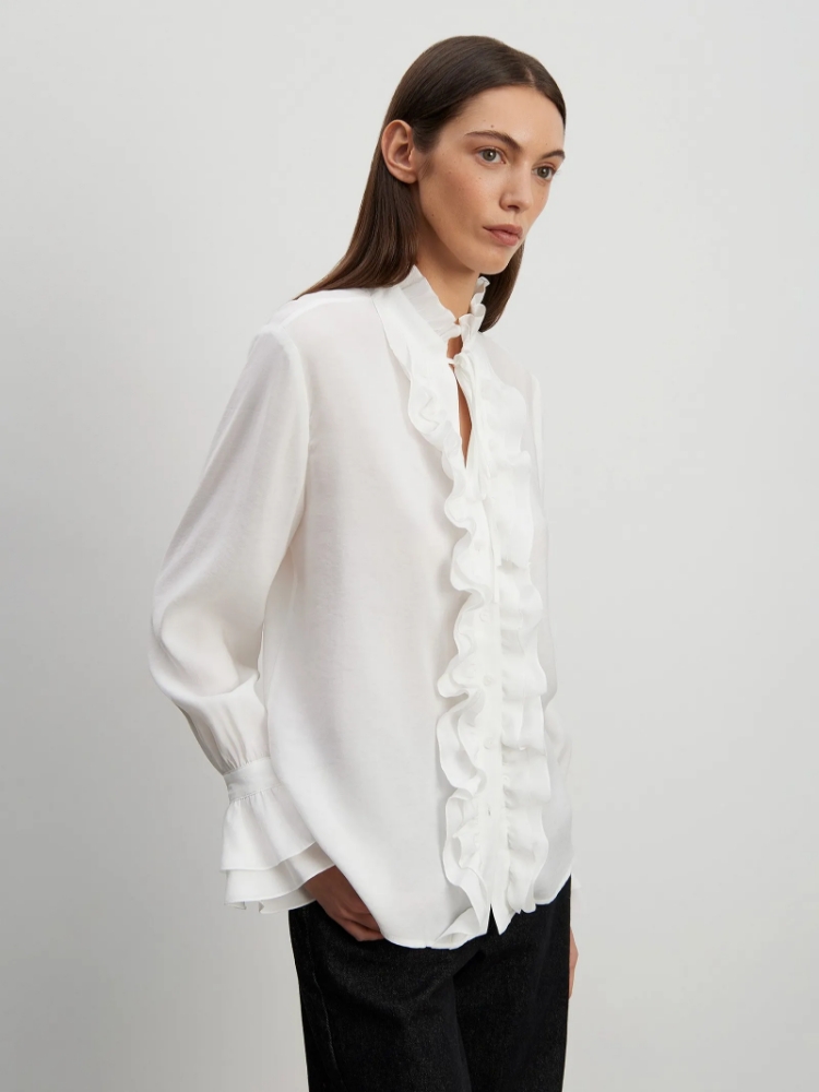 Нарядная рубашка придаст образу большей эстетичности. Модель прямого кроя украшена невысоким воротником-стойкой из рюшей и отделана планкой из воланов. Низ рукавов также выполнен в виде воланов. Рубашка выполнена из комфортной к телу вискозы в молочном цвете. Сочетается с любым базовым низом, подходит для работы и торжественных случаев