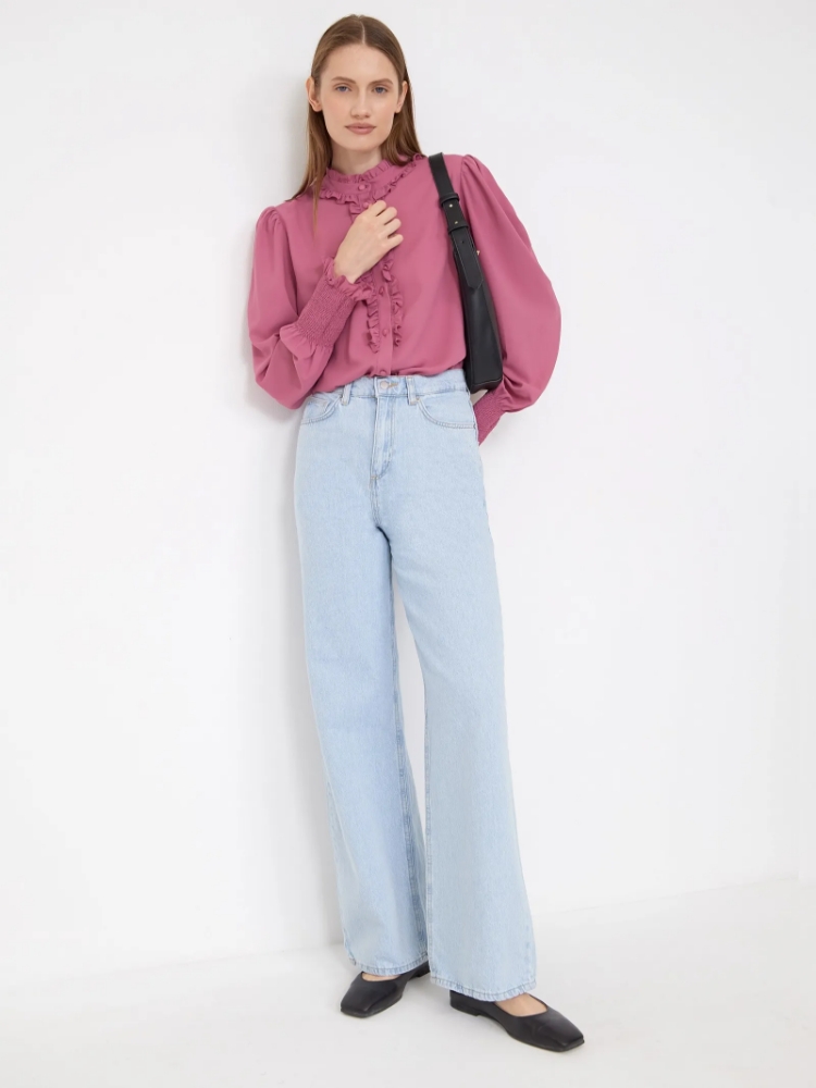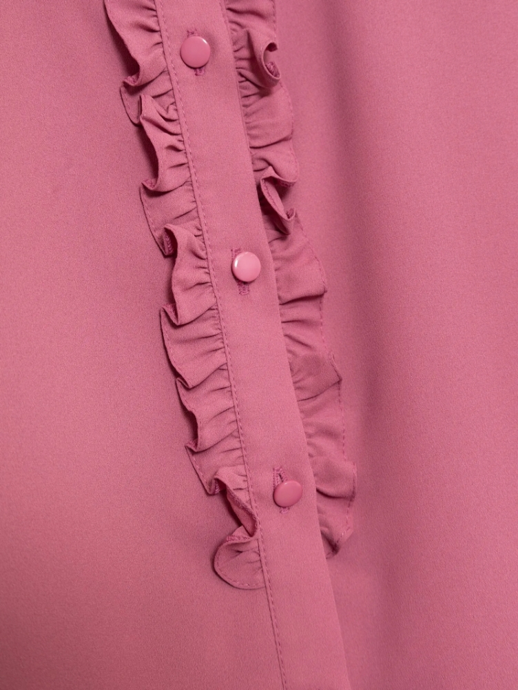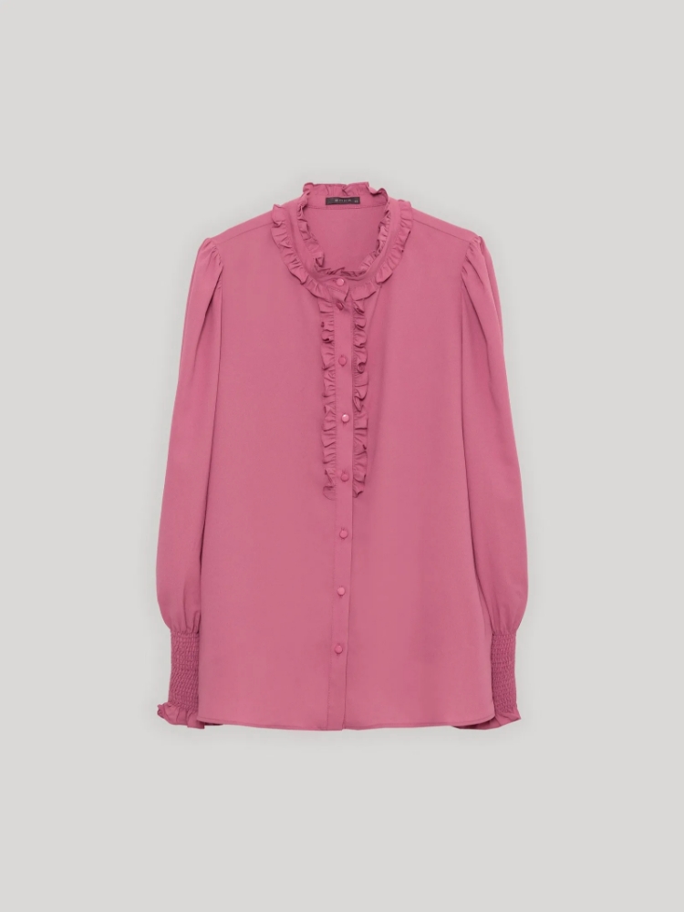 Романтичная блузка розового цвета с рюшами. Модель прямого силуэта отличают изящная планка с рюшами по длине изделия, нежная отделка рюшами по горловине и на рукавах, а также эластичные высокие манжеты. Эластичность и воздушность манжетам обеспечивают параллельные строчки с челоночной ниткой-резинкой. С блузкой можно создавать женственные образы на работу и свидание, на каждый день и на особый случай. Изделие дополнено приятной к телу подкладкой из вискозы