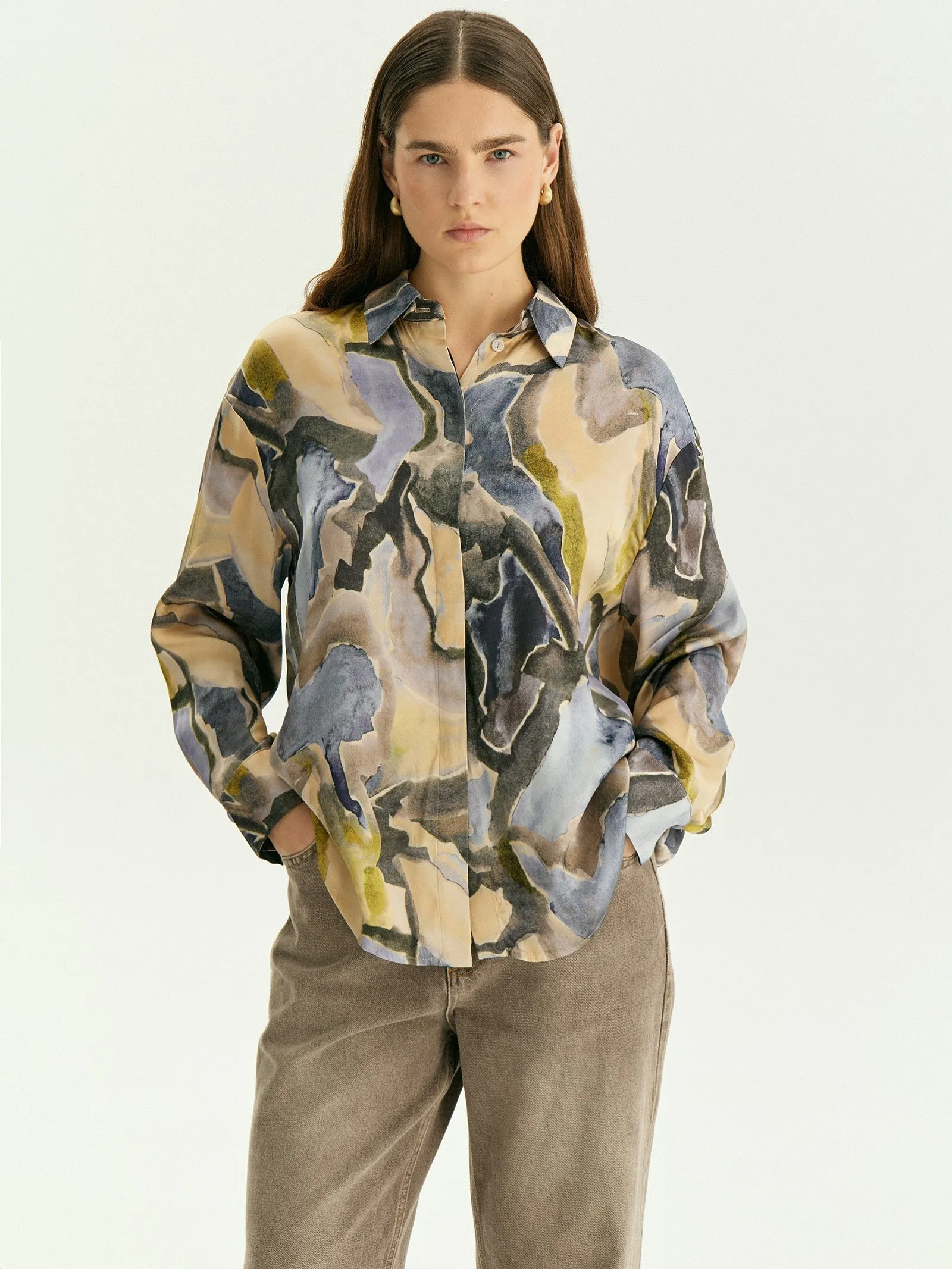 Классическая рубашка украшена модным "минеральным" принтом в актуальных оттенках сезона: принт напоминает аметист, желтый и зелёный мрамор.
