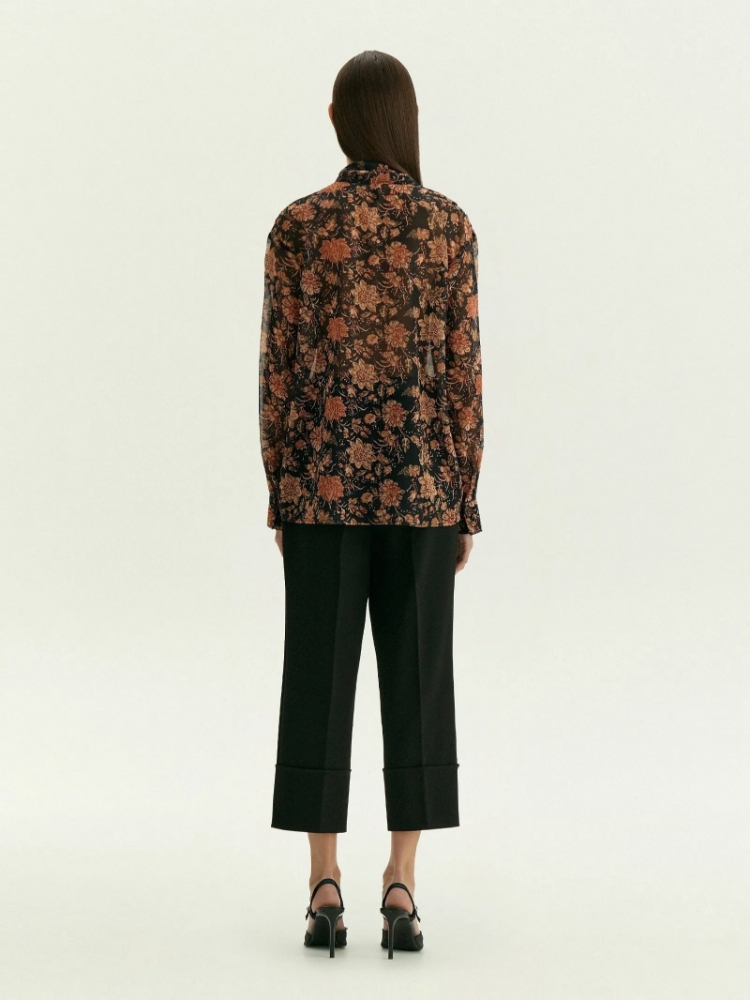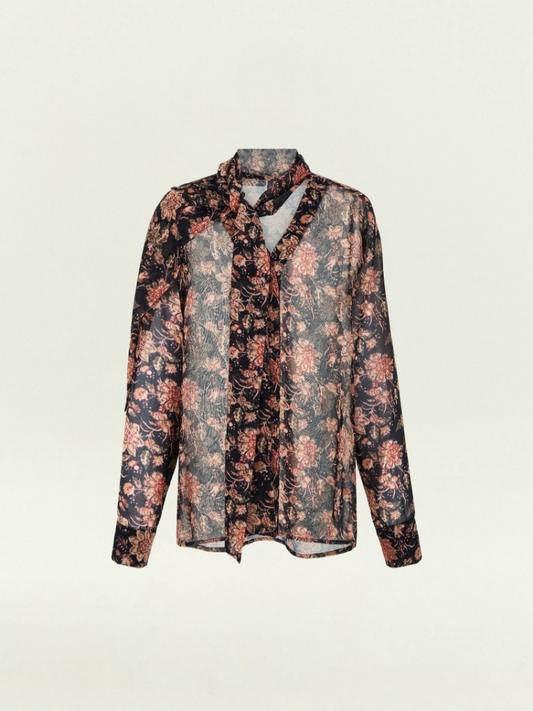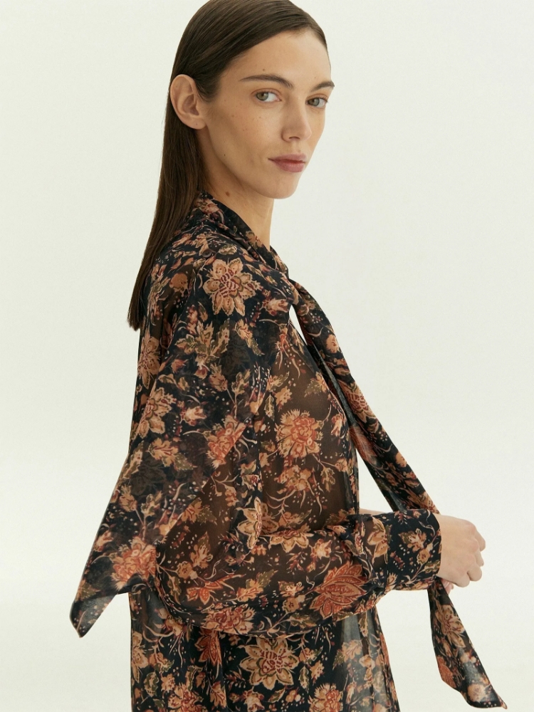 Рубашка из воздушного шифона с фантазийным принтом в актуальных тонах сепии и терракоты. Элегантная модель-трансформер отличается оригинальным воротником, который переходит в шарф. Отлётную часть воротника можно стилизовать множеством разных способов, каждый раз создавая уникальный образ. Изделие идёт без подкладки и без топа в комплекте