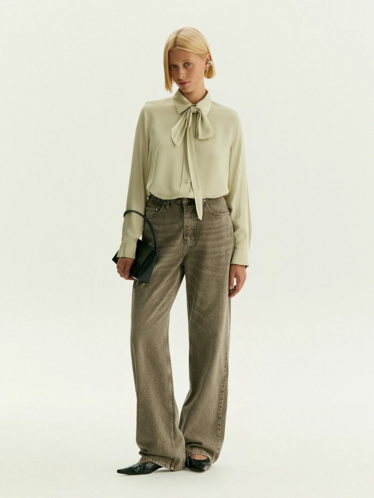 Элегантная рубашка подойдёт как на каждый день, так и к особым случаям. Дорогой и в то же время лёгкий оттенок между хаки и фисташковым поддерживает тренды сезона, создаёт впечатление статусности и актуальности. Стильный воротник-галстук можно повязать разными способами под настроение, чтобы освежить образ. Блуза сделана из материала на основе вискозы