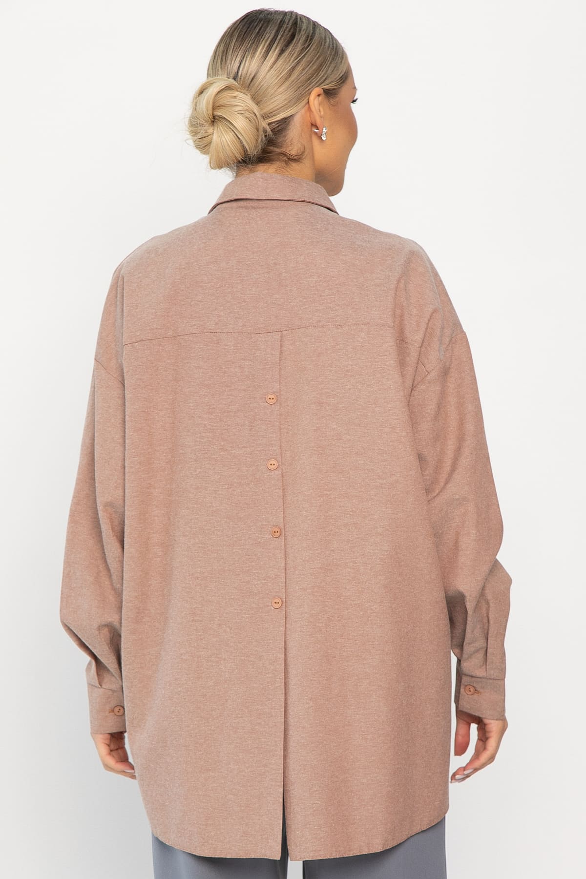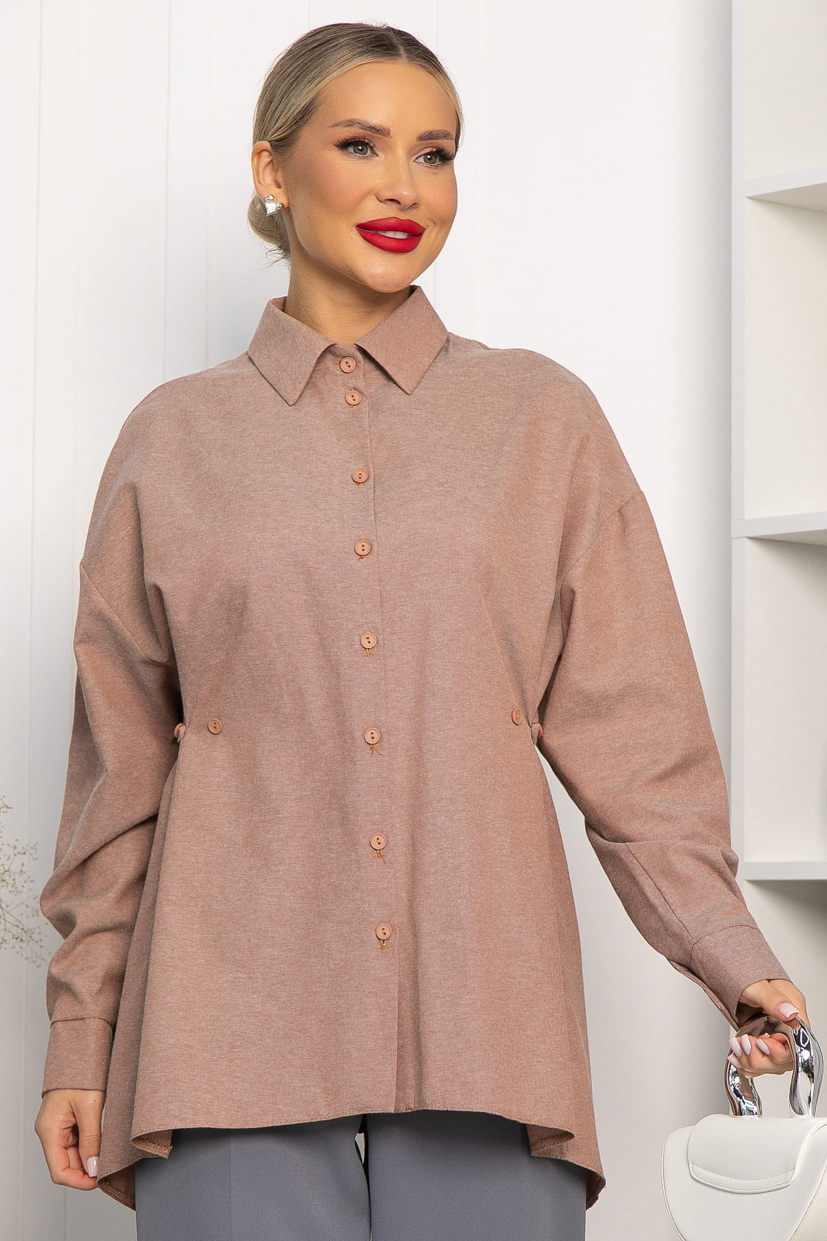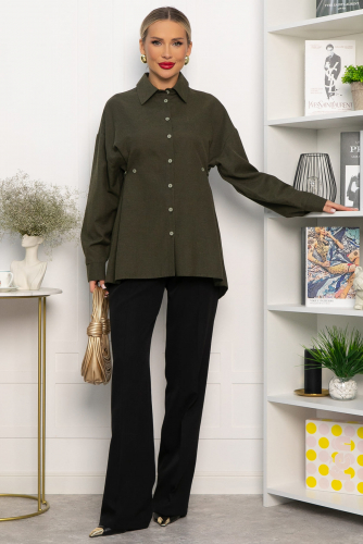 Однотонная оверсайз рубашка — ключевой элемент базового гардероба. Пуговицы, подобранные в тон ткани, придают изделию утонченный вид. Длинные рукава завершаются аккуратными манжетами. Особенностью этой рубашки являются дополнительные пуговицы по бокам спереди, которые помогают подчеркнуть линию талии. На спинке пуговицы декоративные. Рубашку можно носить самостоятельно, дополнив аксессуарами, или надевать поверх топа или футболки, создавая разнообразные образы для любого случая.