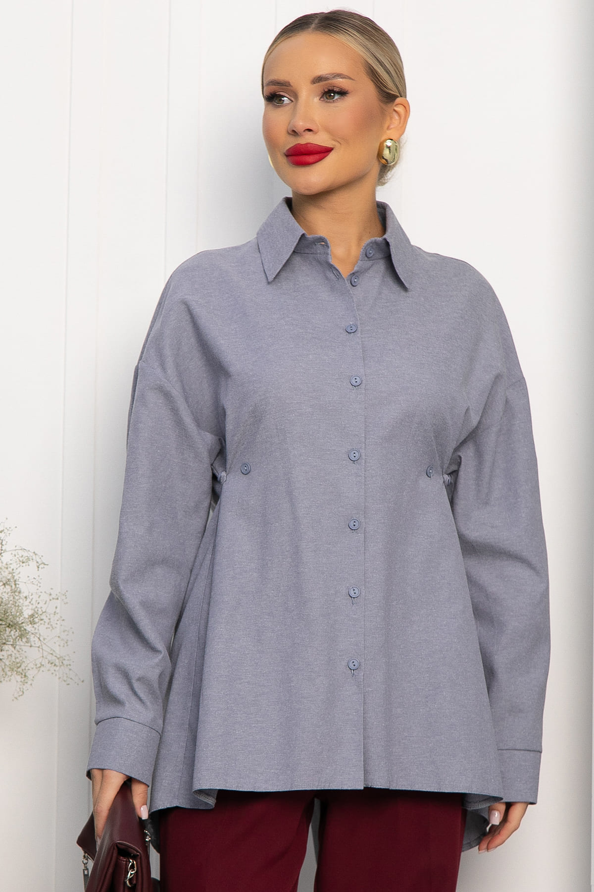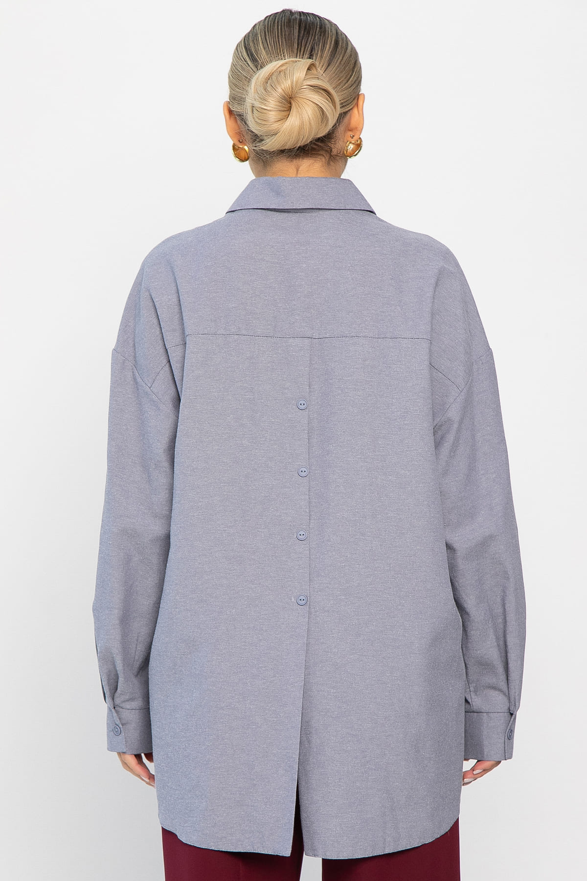 Однотонная оверсайз рубашка — ключевой элемент базового гардероба. Пуговицы, подобранные в тон ткани, придают изделию утонченный вид. Длинные рукава завершаются аккуратными манжетами. Особенностью этой рубашки являются дополнительные пуговицы по бокам спереди, которые помогают подчеркнуть линию талии. На спинке пуговицы декоративные. Рубашку можно носить самостоятельно, дополнив аксессуарами, или надевать поверх топа или футболки, создавая разнообразные образы для любого случая.