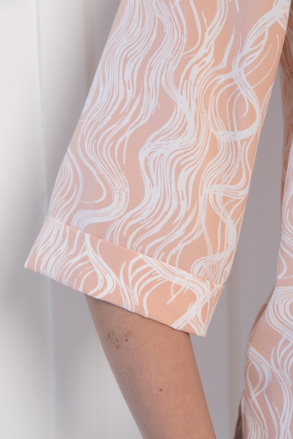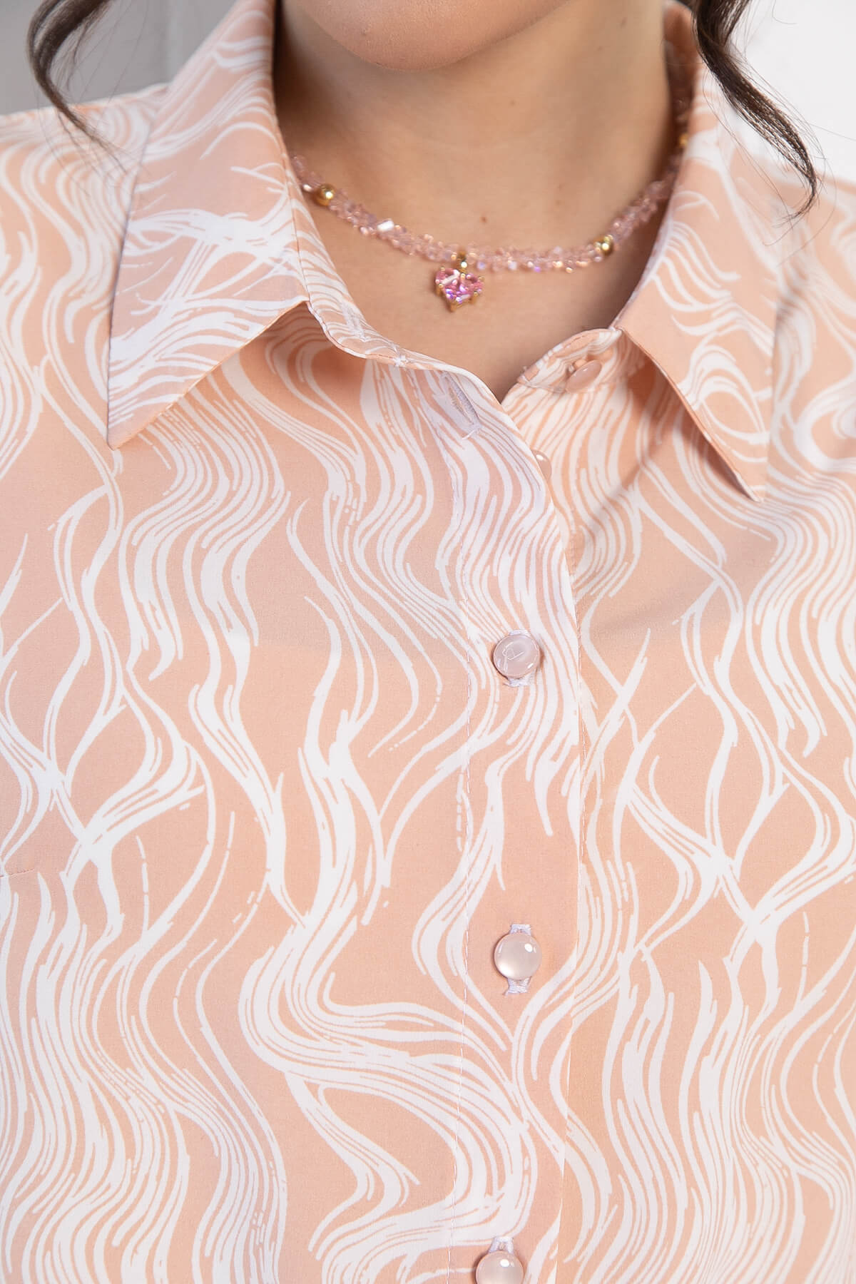 Рубашка в персиковом оттенке и с абстрактным принтом — это то, что нужно для создания стильных образов! Она подходит как для офиса, так и для повседневных образов, поэтому станет незаменимой вещью в вашем гардеробе. Комбинируйте её с классическими брюками, джинсами или юбками, чтобы выглядеть безупречно в любой ситуации. Рукава втачные 3/4, с отворотом. По переду расположены пуговицы, а боковые разрезы обеспечивают свободу движений. Нагрудные вытачки подчёркивают фигуру, создавая изящный силуэт.