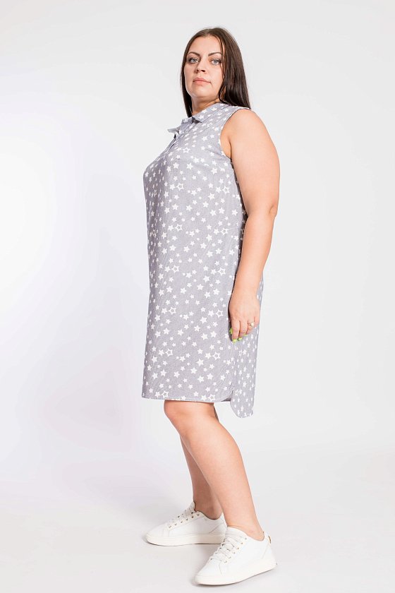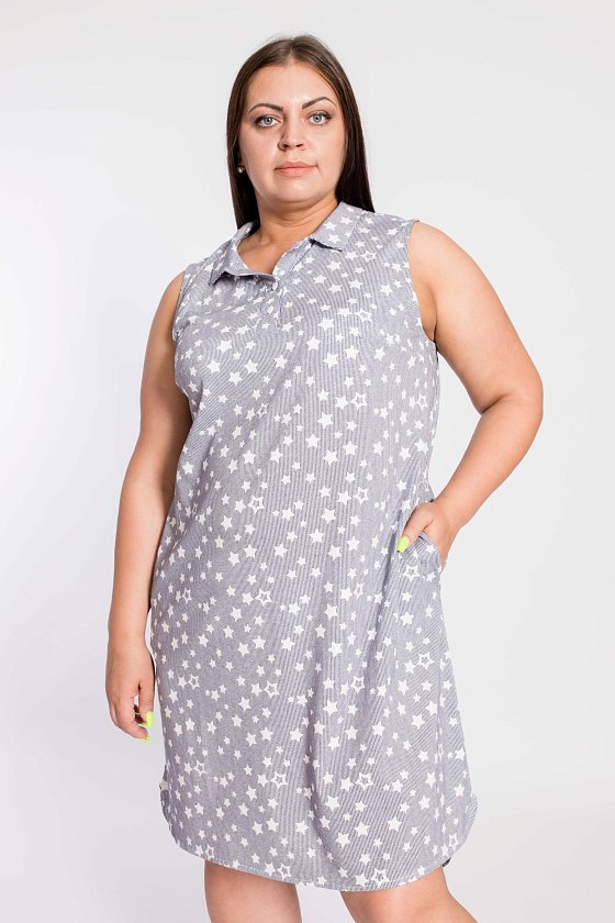 Рубашка-туника выполнена из хлопкового полотна. Покрой свободный, без рукавов, горловина с воротником и планка с застёжкой на пуговицы. По бокам размещены карманы, низ изделия разноуровневый.