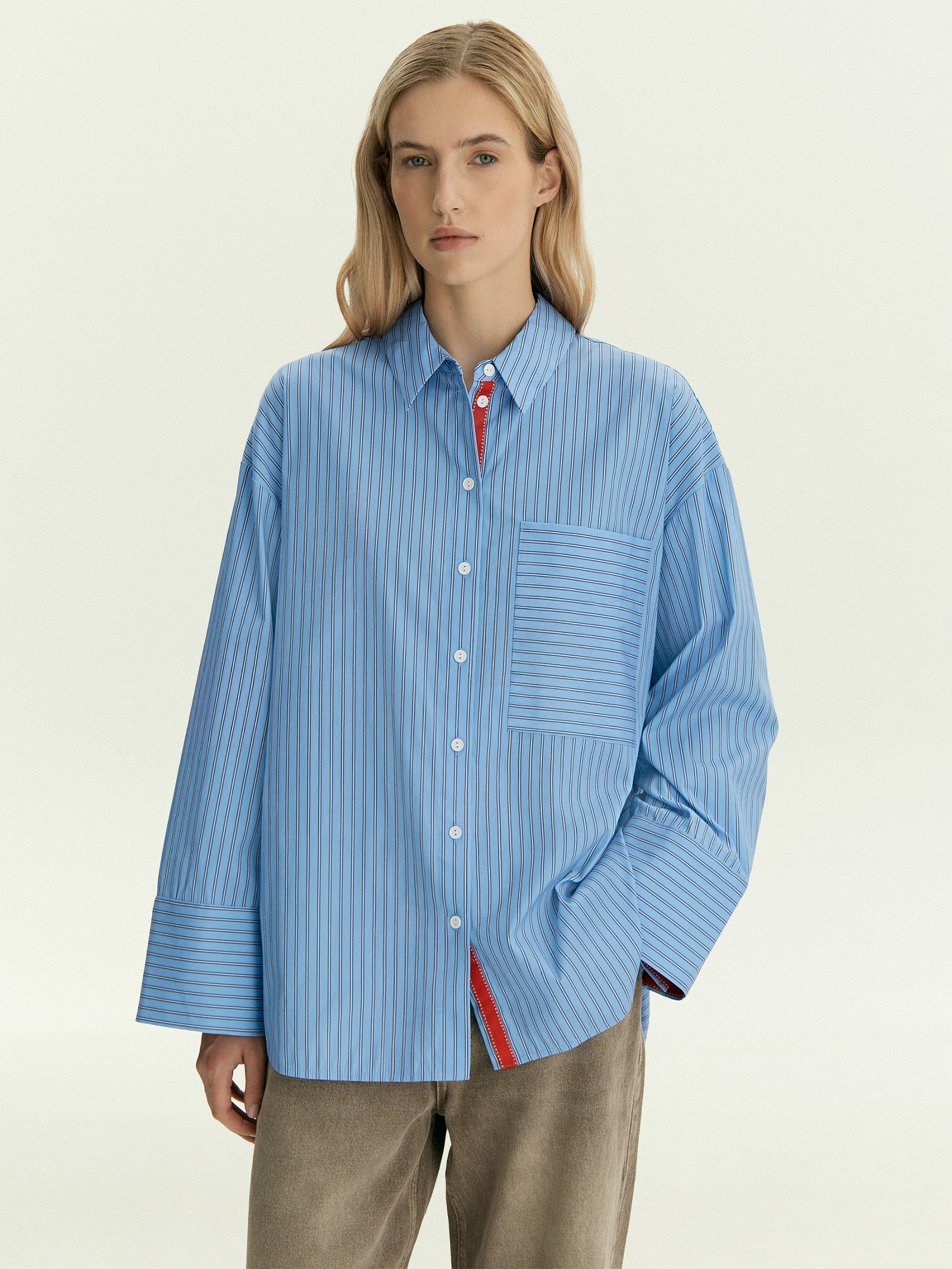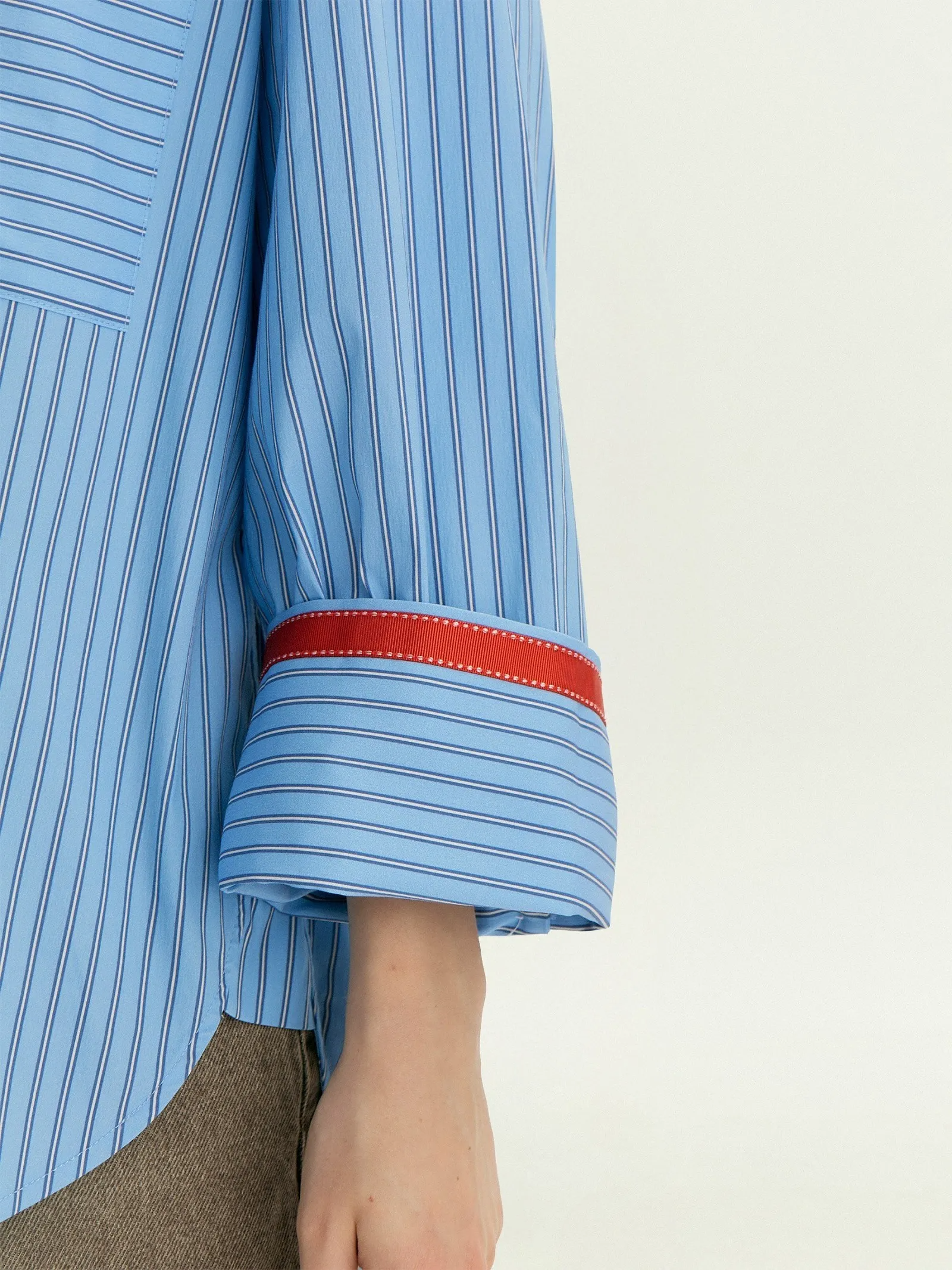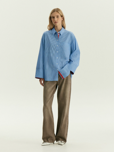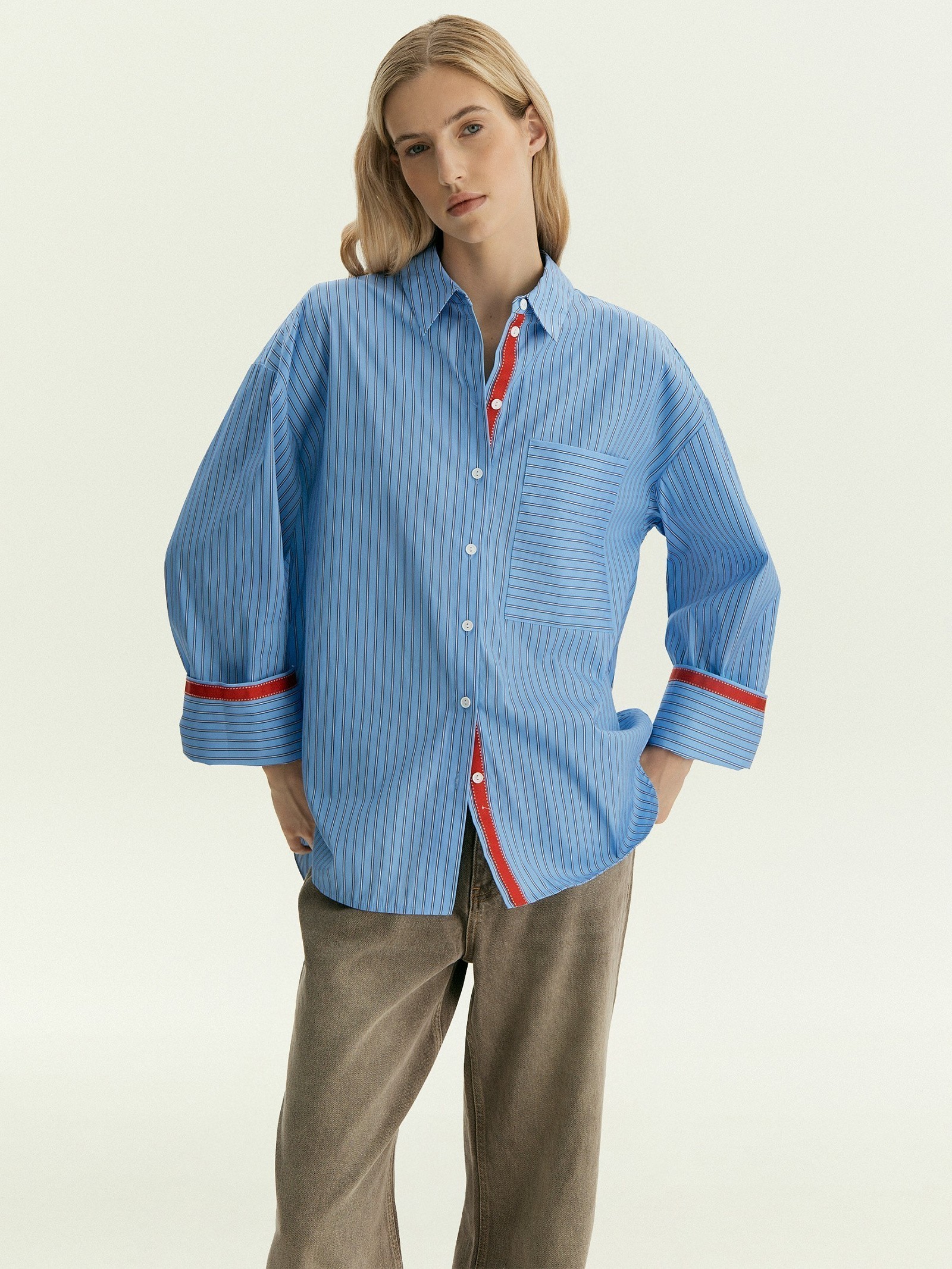 Трендовая синяя рубашка освежит деловой и повседневный гардероб. Изюминки модели — красный кант, крупный накладной карман на груди и свободные, расширяющиеся книзу спущенные рукава, которые завершаются широкими манжетами с другим направлением полоски. Материал выполнен с высоким содержанием хлопка и добавлением эластана.
