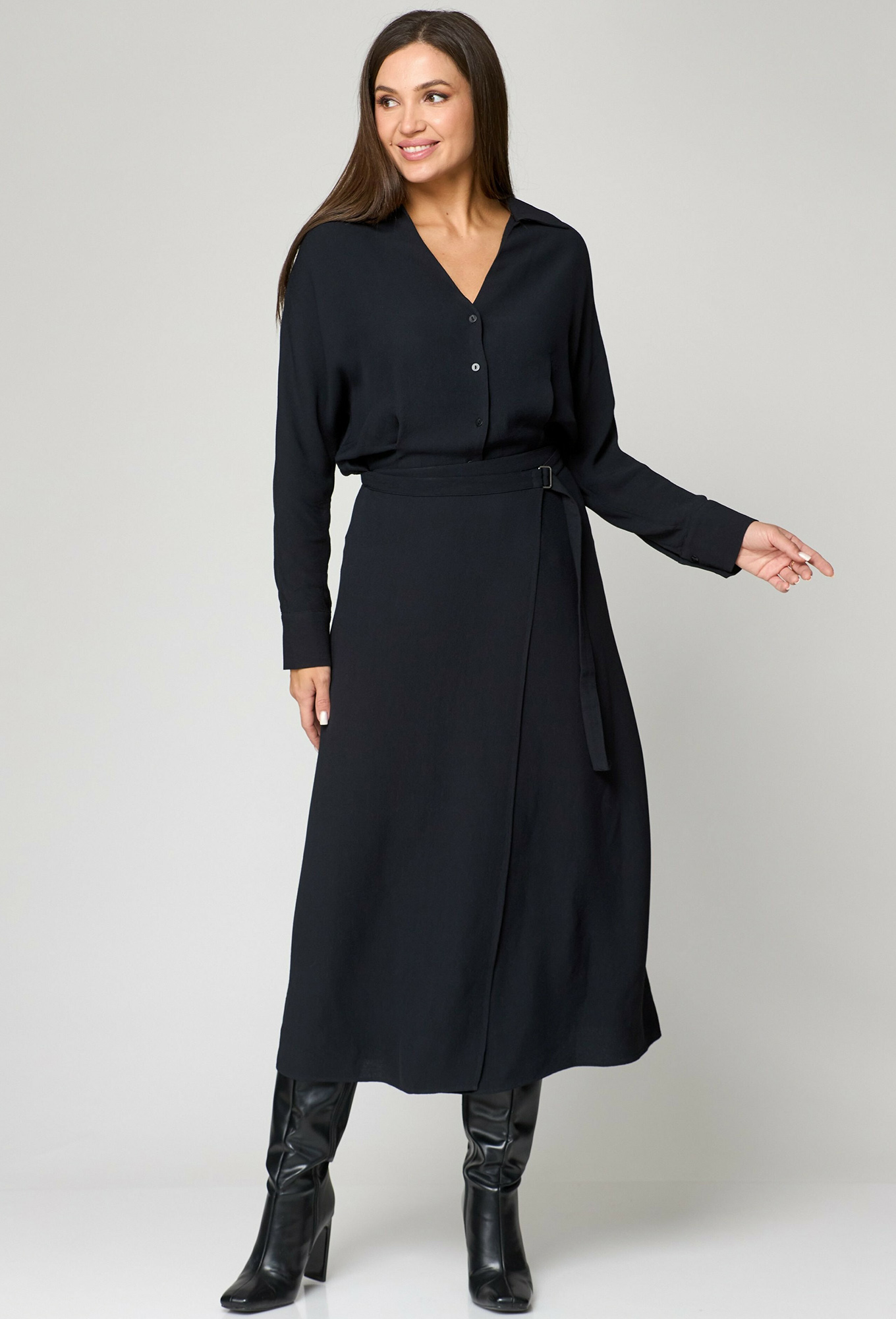 Оригинальное платье (имитация блузки и юбки) отрезное по линии талии с цельнокроеным рукавом. По низу рукава складки собраны на манжету с застежкой на 2 пуговицы. Воротник рубашечного типа с притачной стойкой. Застежка центрально-бортовая в верхней части на 5 пуговиц. Верхняя часть спинки свободная, со средним швом и присобрана на притачной к нижней, расширенной к низу части. Нижняя часть - юбка на запах с застежкой на потайную пуговицу и пряжкой на верхней половинке. Платье можно носить в 3 вариациях, разрез юбки регулировать с помощью пояса, заправлять блузон или на выпуск.