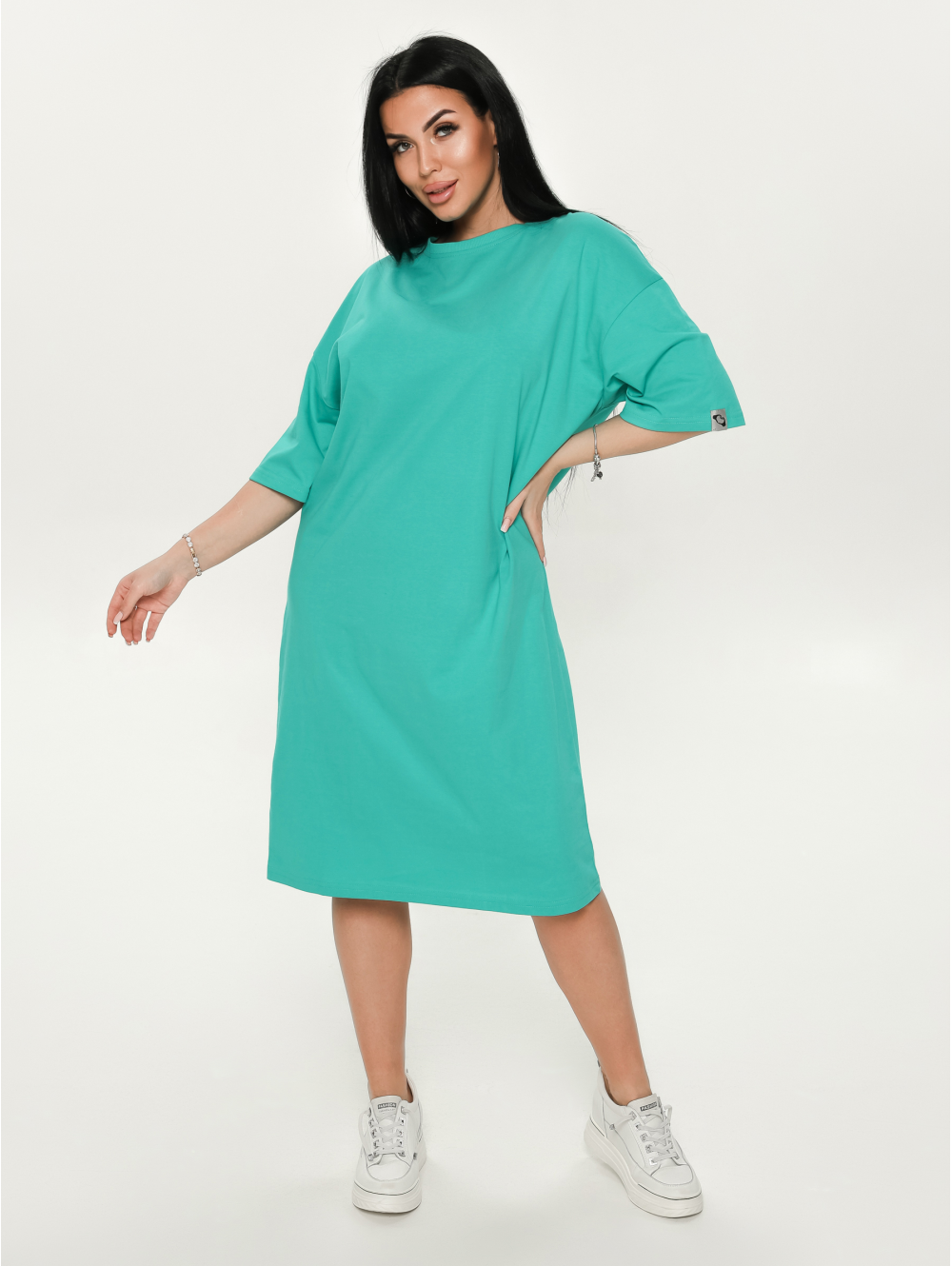 Платье оверсайз с коротким втачным рукавом, длиной ниже колен. Горловина обработана обтачкой из кашкорсе.