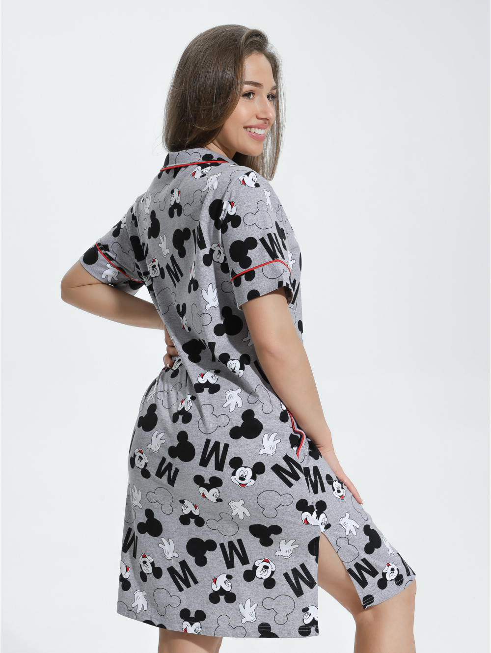 Халат прямого силуэта с центральной бортовой застежкой на 6 петель и пуговиц, с втачным воротником, с коротким втачным рукавом с манжетой.