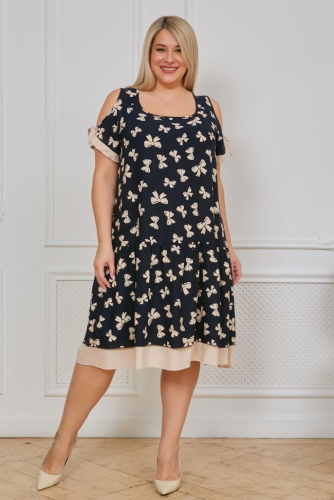 темно-зеленый Летний сарафан свободного силуэта длиной до линии колен. Выполнен из штапельной ткани с  принтом "цветные горохи". Вырез горловины обработан окантовкой. Рукава-реглан с фигурным вырезом и воланом по низу, переходящим в завязки. Низ изделия с широкой притачной оборкой. Модель прекрасно подходит модницам с любыми формами. Отличный выбор для создания комфортного летнего образа.
