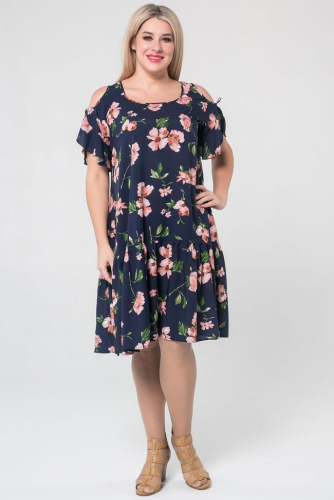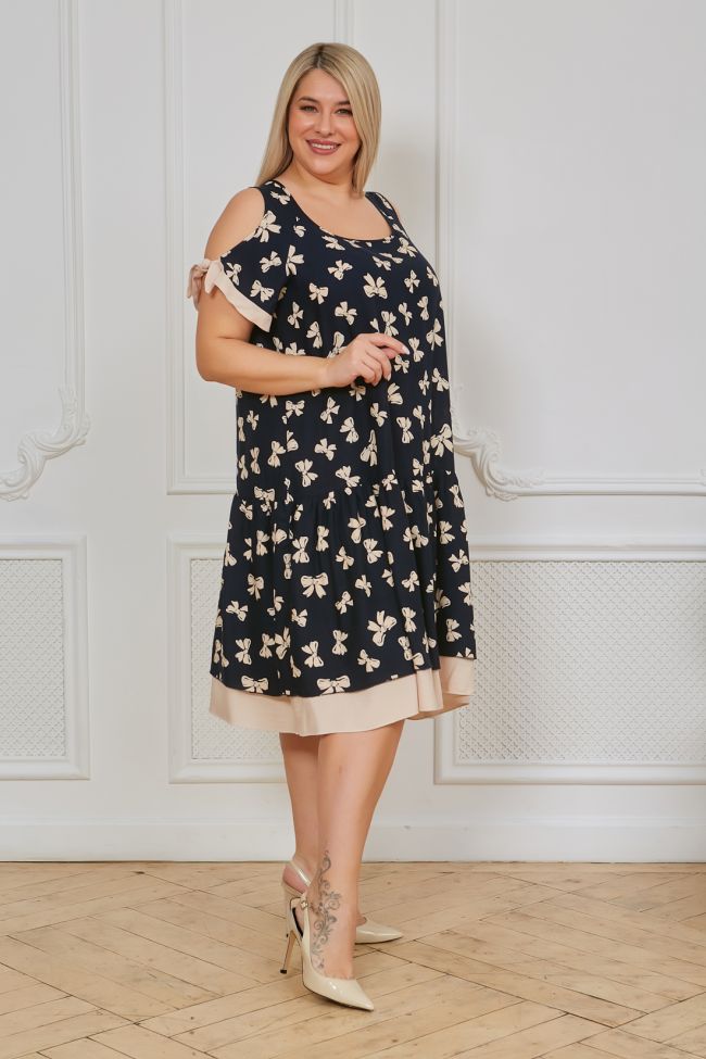 темно-синий Летний сарафан свободного силуэта длиной до линии колен. Выполнен из штапельной ткани с принтом "бантики" и отделочными деталями в тон принта. Вырез горловины обработан окантовкой. Рукава-реглан с фигурным вырезом и притачной отделочной деталью, переходящей в бант. Низ изделия с двойной широкой оборкой, нижняя оборка из отделочной однотонной ткани, дополняющей отделку на рукаве. Комфортная модель для повседневного образа отлично скрывающая все недостатки фигуры.