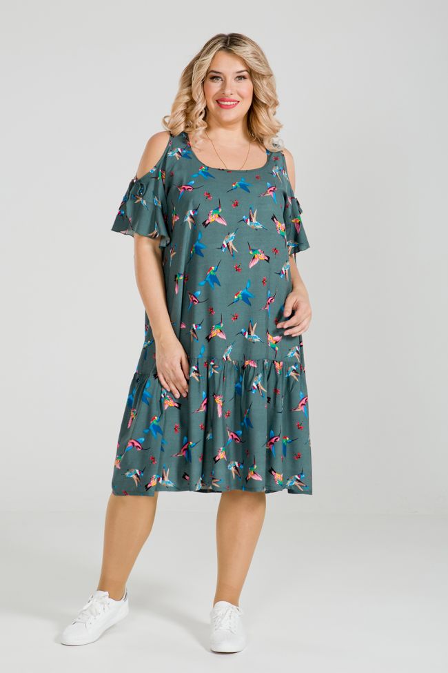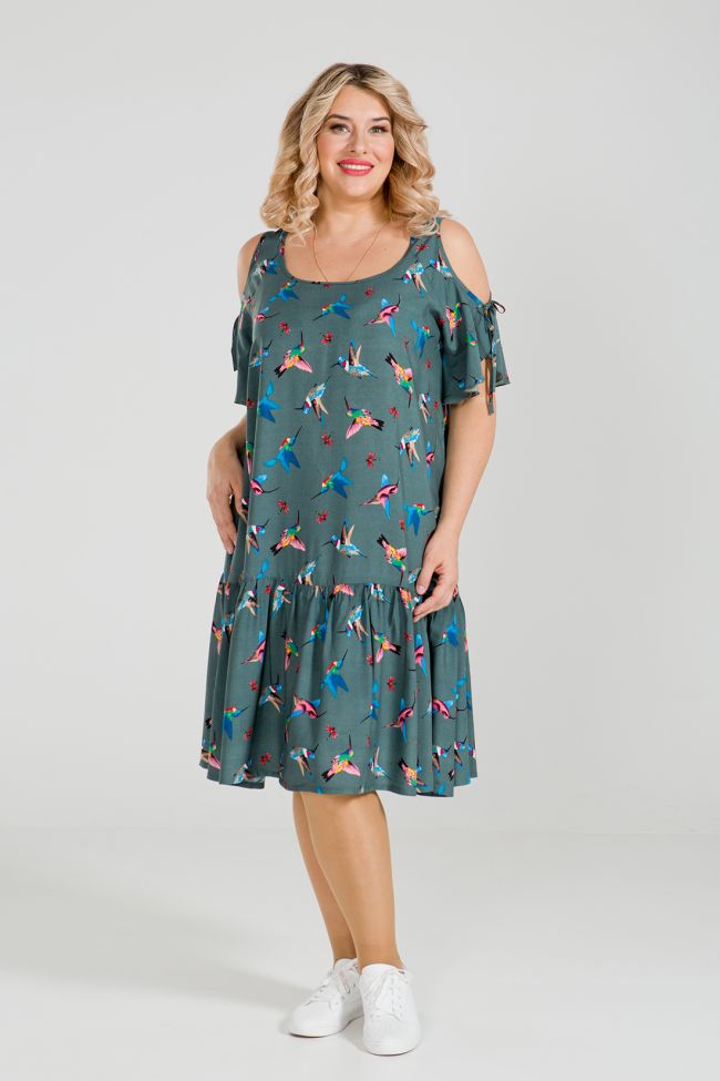 зеленый Современный сарафан прямого силуэта из хлопковой штапельной ткани с принтом. Вырез горловины обработан окантовкой. Рукава-реглан с воланом по низу. Низ с широким притачным воланом. Модель прекрасно подходит модницам с любыми формами. Отличный выбор для создания уютного повседневного образа.