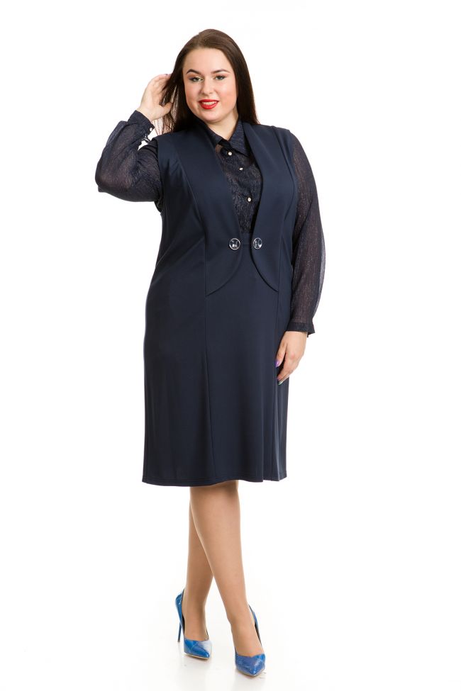 темно-синий Деловой сарафан полуприлегающего силуэта из трикотажного полотна джерси. Центральная часть переда с имитацией жилета и юбки с фиксацией на 2 крупные пуговицы. Вырез горловины обработан внутренней обтачкой. Прилегание по фигуре достигнуто за счет вертикальных рельефов. В среднем шве спинки - шлица. Модель отлично подчеркнет Вашу элегантность и женственность. Отличный выбор для комбинации с водолазками и рубашками.