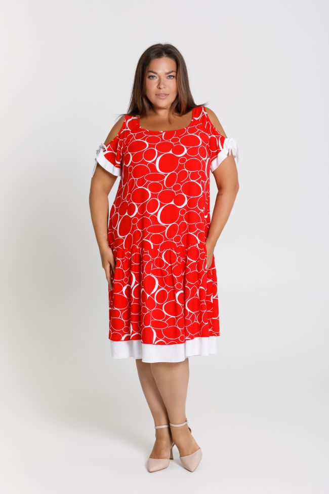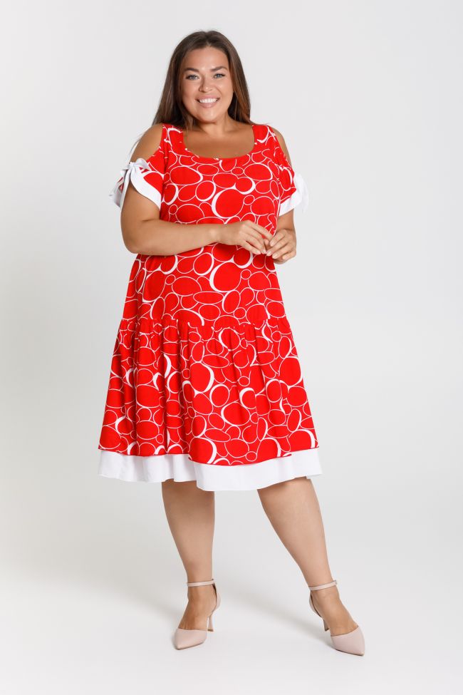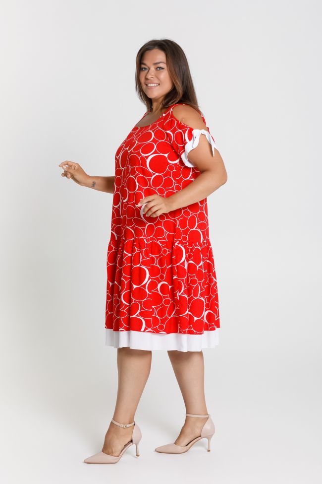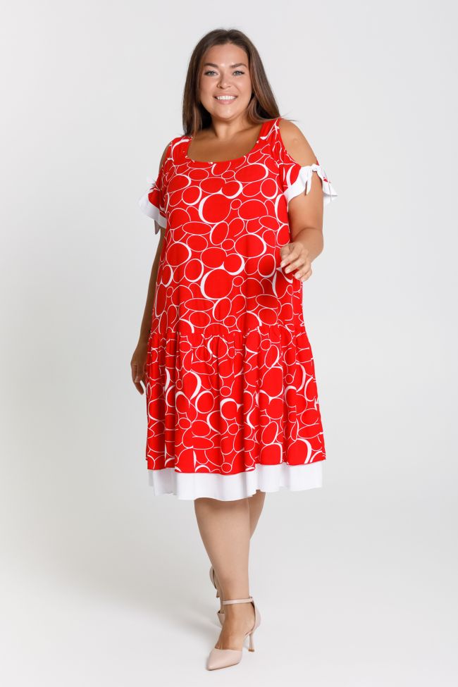 красный Летний сарафан свободного силуэта длиной до линии колен. Выполнен из штапельной ткани с принтом и отделочными деталями. Вырез горловины обработан окантовкой. Рукава-реглан с фигурным вырезом и притачной отделочной деталью, переходящей в бант. Низ изделия с двойной широкой оборкой, нижняя оборка из отделочной однотонной ткани, дополняющей отделку на рукаве. Комфортная модель для повседневного образа отлично скрывающая все недостатки фигуры.