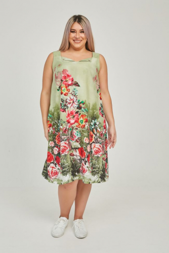 серый Летний сарафан, свободного силуэта на широких бретелях, из штапельной ткани с ярким купонным принтом "цветы". Прилегание по груди за счет вытачек. Фигурный вырез горловины оригинально дополнен отложными уголками с фиксацией на пуговицу. В боковых швах удобные карманы, низ ровный. Комфортная модель для повседневного летнего образа.